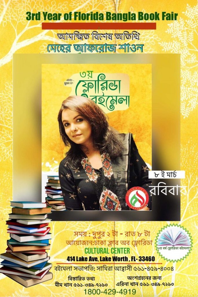 ফ্লোরিডা বই মেলা ৮ মার্চ, প্রধান অতিথি মেহের আফরোজ শাওন