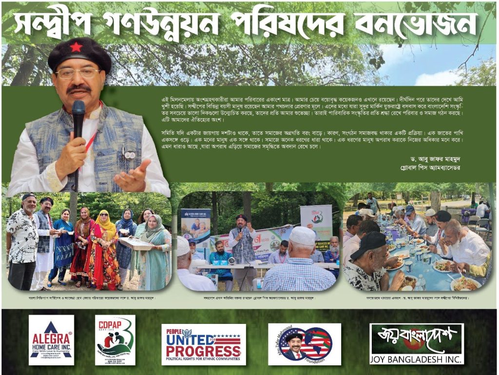 পিপল ইউনাইটেড ফর প্রোগ্রেস ‘পিপল আপ’, জয় বাংলাদেশ ইনক্ ও আবু জাফর মাহমুদ ফাউ-েশনের প্রতিষ্ঠাতা এবং বাংলা সিডিপ্যাপ সার্ভিসেস ও অ্যালেগ্রা হোম কেয়ারের প্রেসিডেন্ট ও সিইও ড. আবু জাফর মাহমুদ বলেন, এখনকার সময়টি বাংলাদেশের জন্য অত্যন্ত তাৎপর্যপূর্ণ। এই মার্কিন যুক্তরাষ্ট্রে আমার ত্রিশটি বছর পার হয়েছে। এই সময়ে বলতে চাই, রাষ্ট্র যদি ভালো মানুষের কাছে থাকে, তাহলে সাধারণ মানুষের পক্ষে তাদের প্রয়োজনীয় কাজগুলো করা সহজ হয়। কিন্তু এমন অবস্থাটি অনেক বছর ধরেই নেই। আমাদের শিক্ষা থেকে শুরু করে জ্ঞান ও চিন্তা যা অর্জন করেছি, তার পেছনে সবচেয়ে বড় অবদান আমাদের দেশের জনগণের। আমরা জাকাত দিয়ে যেমন সম্পদ পবিত্র করি, আমাদের জ্ঞান ও প্রজ্ঞা পবিত্র করার জন্য আমার পরিবার, সমাজ, দেশ ও বিশ্ব পরিম-লে সেই জাতাকটি দিতে হবে।