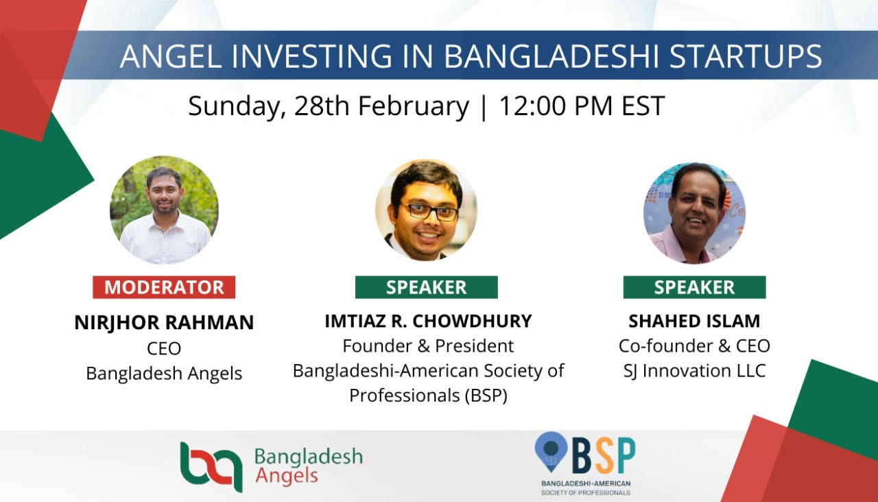 ইউএসএনিউজঅনলাইন.কম ডেস্ক, নিউইয়র্ক: যুক্তরাষ্ট্রে বসবাসরত বাংলাদেশী কর্পোরেট পেশাজীবীদের সংগঠন বাংলাদেশী-আমেরিকান সোসাইটি অফ প্রফেশনালস (বিএসপি) এবং বাংলাদেশ এনজেলস সম্প্রতি যৌথভাবে এক ওয়েবিনারের আয়োজন করে। এই ইভেন্টের প্রধান উদ্দেশ্য ছিল বাংলাদেশী স্টার্ট-আপ কোম্পানিতে কিভাবে বিনিয়োগ করা যায় সেই বিষয়ে আলোচনা করা। বাংলাদেশ এঞ্জেলস এর সিইও নির্ঝর রহমানের পরিচালনায় অনুষ্ঠানে প্রথম বক্তা ছিলেন বিএসপির প্রেসিডেন্ট ইমতিয়াজ চৌধুরী। তিনি বিএসপি গঠনের উদ্দেশ্য এবং কার্যক্রম সম্পর্কে আলোচনা করেন। পরবর্তী বক্তা এসজে ইনোভেশনের সিইও সাহেদ ইসলাম বাংলাদেশের সেবা খাতে, বিশেষভাবে আইটি খাতে বিনিয়োগের গুরুত্ব ও সম্ভাবনা তুলে ধরেন। ইভেন্টের শেষ পর্বে বাংলাদেশ এঞ্জেলস এর কার্যক্রম এবং বাংলাদেশে স্টার্ট-আপ কোম্পানিতে বিনিয়োগকারীদের নিয়ে আলোচনা করেন নির্ঝর রহমান। ওয়েবিনারে বিএসপি এবং বাংলাদেশ এঞ্জেলস এর অনেক সদস্য উপস্থিত ছিলেন।