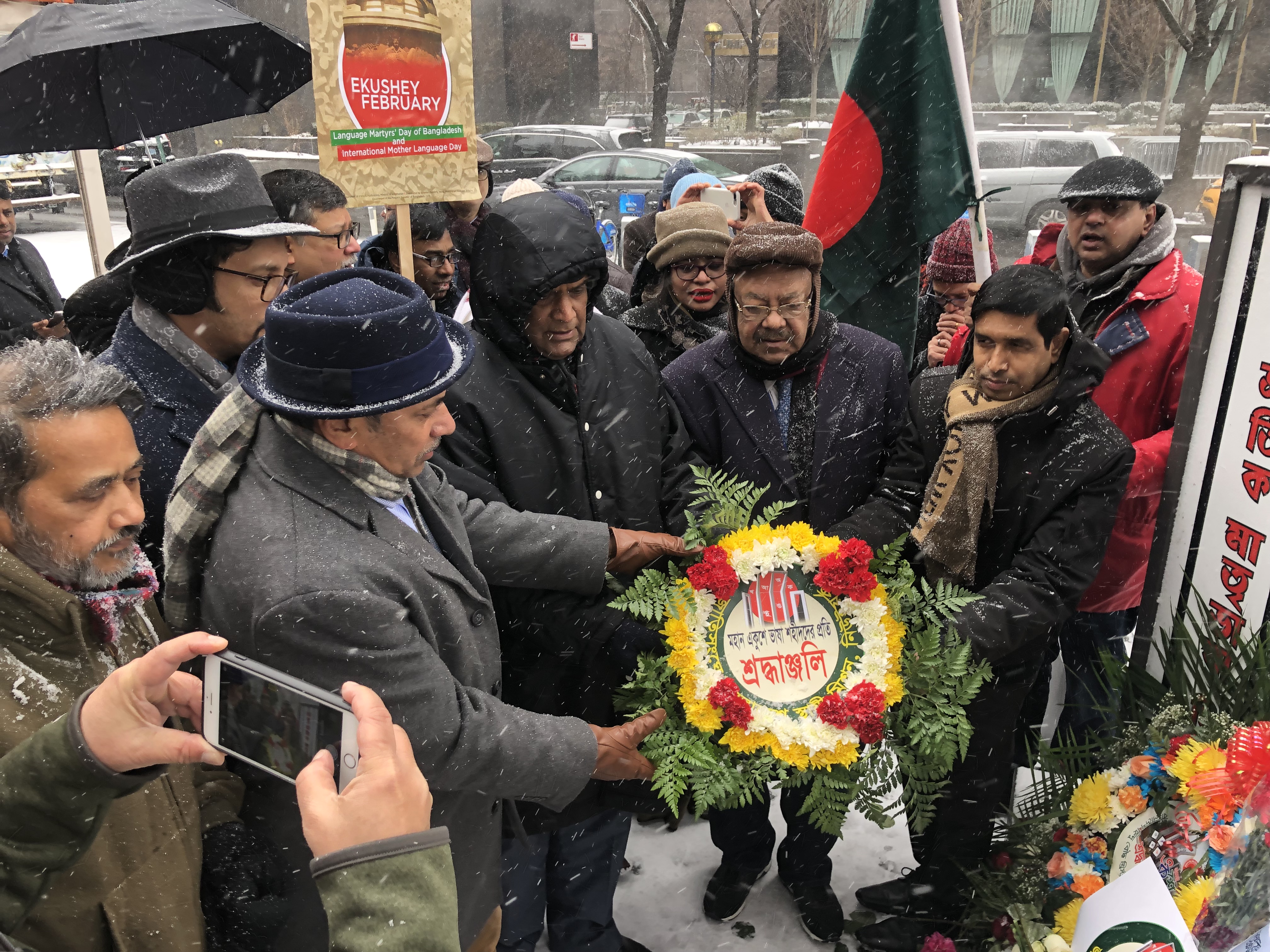 বাংলাদেশের একুশের প্রথম প্রহরের সঙ্গে মিল রেখে জাতিসংঘের সামনে বিনম্র শ্রদ্ধায় শহীদদের স্মরণ