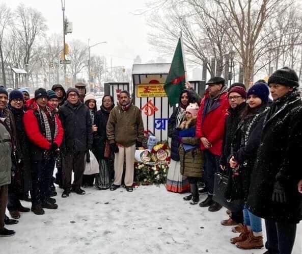 ইউএসএনিউজঅনলাইন.কম, নিউইয়র্ক: বাংলাদেশের একুশের প্রথম প্রহরের সঙ্গে মিল রেখে বুধবার নিউইয়র্ক সময় দুপুর ১টা ১ মিনিটে জাতিসংঘ সদর দপ্তরের সামনে স্থাপিত অস্থায়ী শহীদ মিনারে শহীদদের শ্রদ্ধা জানানো হয়। মহান একুশে ও আন্তর্জাতিক মাতৃভাষা দিবস উদযাপন উপলক্ষে মুক্তধারা ফাউন্ডেশন ও বাঙ্গালীর চেতনা মঞ্চের উদ্যোগে যথাযোগ্য মর্যাদায় দিবসটি উদযাপিত হয়। এসময় সাবেক স্বাস্থ্যমন্ত্রী এএফএম রুহুল হক এমপি, সাবেক প্রাথমিক ও গণ শিক্ষামন্ত্রী ড. মো. আফসারুল আমিন এমপি, আবু জাহির এমপি, মো: বেনজির আহমেদ এম.পি, আহসান আদেলুর রহমান এমপি, জাতিসংঘে নিযুক্ত বাংলাদেশের রাষ্ট্রদূত ও স্থায়ী প্রতিনিধি মাসুদ বিন মোমেন, নিউইয়র্কে বাংলাদেশের কনসাল জেনারেল সাদিয়া ফয়জুন্নেসা সহ কূটনীতিক, নিউইয়র্কের সামাজিক, সাংস্কৃতিক ও সাহিত্যাঙ্গনের প্রতিনধিরা শহীদদের প্রতি শ্রদ্ধা জানান। বৈরী আবহাওয়াকে উপেক্ষা করে বিপুল সংখ্যক প্রবাসী শহীদদের প্রতি শ্রদ্ধা জানান। এর মধ্য দিয়ে মুক্তধারা ফাউন্ডেশন ও বাঙ্গালীর চেতনা মঞ্চের আয়োজনে জাতিসংঘ সদর দপ্তরের সামনে স্থাপিত অস্থায়ী শহীদ মিনারে শহীদদের শ্রদ্ধা জানানোর ২৮ বছর পূর্তি হল।