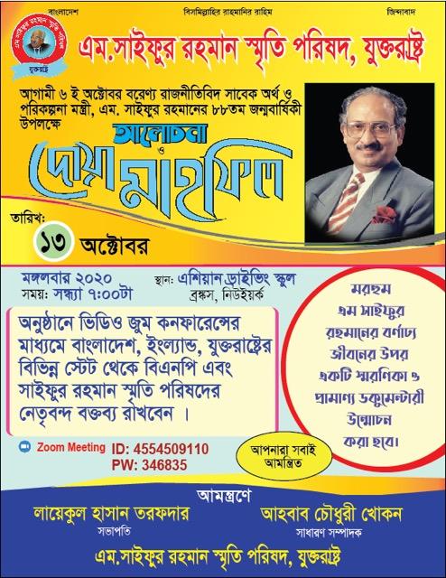 বাংলাদেশের সাবেক অর্থমন্ত্রী সাইফুর রহমানের ৮৮ তম জন্ম বার্ষিকি উপলক্ষে নিউইয়র্কে আলোচনা সভা ও দোয়া মাহফিল ১৩ই অক্টোবর