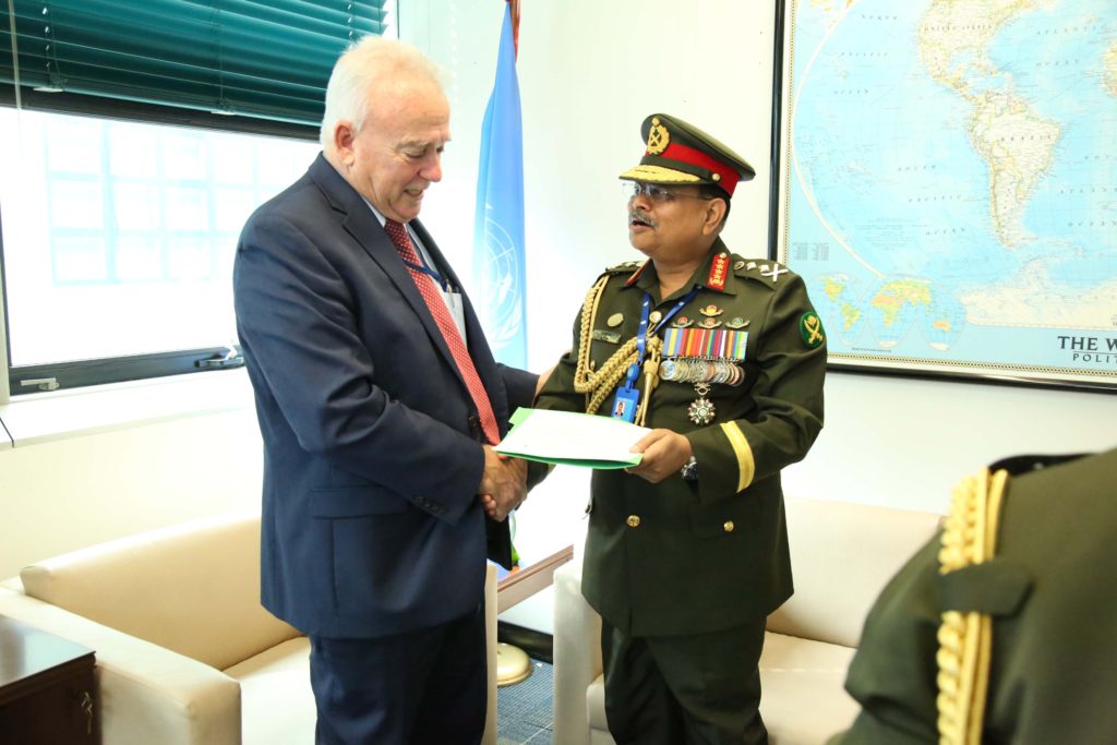 ৯ জুলাই সকালে সেনাবাহিনী প্রধান জাতিসংঘ সদরদপ্তরে জাতিসংঘের পিস অপারেশন বিভাগের প্রধান আন্ডার সেক্রেটারি জেনারেল জ্যঁ পিয়েরে ল্যাক্রুয়ার সাথে বৈঠক করেন। বৈঠককালে সেনাবাহিনী প্রধান ফরাসি ভাষাভাষী দেশগুলোতে বাংলাদেশের সেনা মোতায়েনের জন্য প্রয়োজনীয় সক্ষমতা অর্জনে বাংলাদেশ সরকারের বিভিন্ন প্রচেষ্টা সম্পর্কে অবহিত করেন। বিশেষ করে, বিশ্বের যে কোনো প্রান্তে চ্যালেঞ্জিং পরিবেশে সেনা পাঠানোর ক্ষেত্রে বাংলাদেশের তাৎক্ষণিক প্রস্তুতি রয়েছে মর্মে জ্যঁ পিয়েরে ল্যাক্রুয়াকে অবহিত করেন বাংলাদেশ সেনাবাহিনী প্রধান।