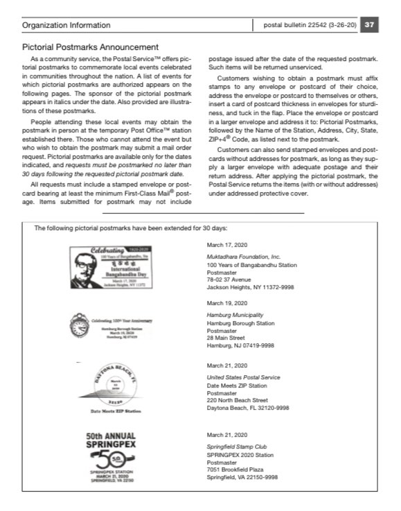 পোস্ট অফিস সূত্রে জানা যায়, আগামী ১৬ এপ্রিল পর্যন্ত জ্যাকসন হাইটস ইউএস পিএস পোস্ট অফিস থেকে বঙ্গবন্ধু স্মারক ডাকচিহ্ন সংগ্রহ করা যাবে। উল্লেখ্য, মুক্তধারা ফাউন্ডেশনের উদ্যোগে এই দিবস উপলক্ষে একটি পোস্ট কার্ড প্রকাশ করা হয় যা গুরুত্বপূর্ণ ব্যক্তিদের ইউএসপিএস এর মাধ্যমে প্রেরণ করা হয়।