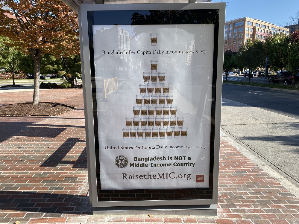 ইউএসএনিউজঅনলাইন.কম ডেস্ক, ওয়াশিংটন : যুক্তরাষ্ট্রের রাজধানী ওয়াশিংটন ডিসির বিভিন্ন বাসষ্ট্যান্ডে ’বাংলাদেশ ইজ নট এ মিডল ইনকাম কান্ট্রি’ সম্বলিত বিজ্ঞাপন প্রচার করছে এইডস হেলথকেয়ার ফাউন্ডেশন (এএইচএফ) পরিচালিত এডভোক্যাসি গ্রুপ রেইজ দ্য মাইক (মিডল ইনকাম কান্ট্রি)। প্রচারিত এই বিজ্ঞাপনে বলা হয়, বাংলাদেশের পার ক্যাপিটা ইনকাম প্রায় ৪.৮০ ডলার এবং যুক্তরাষ্ট্রের পার ক্যাপিটা ইনকাম প্রায় ১৭২ ডলার। বিশ্বব্যাংকের লগো সম্বলিত এইডস হেলথকেয়ার ফাউন্ডেশন (এএইচএফ) পরিচালিত এডভোক্যাসি গ্রুপ রেইজ দ্য মাইক (মিডল ইনকাম কান্ট্রি) এর এই পোষ্টার এখন ওয়াশিংটন ডিসির বিভিন্ন স্থানে দেখা যাচ্ছে।