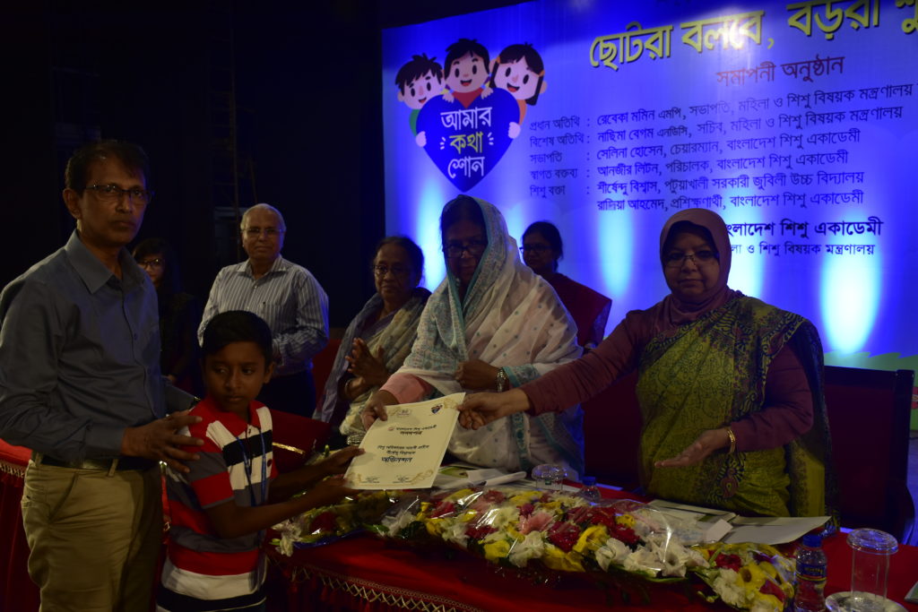 আলোচনা সভা ও সমাপনী অনুষ্ঠানে প্রধান অতিথি হিসেবে উপস্থিত ছিলেন মহিলা ও শিশু বিষয়ক মন্ত্রণালয় সম্পর্কিত সংসদীয় স্থায়ী কমিটির সভাপতি রেবেকা মমিন এমপি, বিশেষ অতিথি হিসেবে উপস্থিত ছিলেন মহিলা ও শিশু বিষয়ক মন্ত্রণালয়ের সচিব নাছিমা বেগম এনডিসি, অনুষ্ঠানে সভাপতিত্ব করেন বাংলাদেশ শিশু একাডেমীর চেয়ারম্যান কথাসাহিত্যিক সেলিনা হোসেন, স্বাগত বক্তব্য রাখেন বাংলাদেশ শিশু একাডেমীর পরিচালক শিশুসাহিত্যিক আনজীর লিটন ও শিশু বক্তা হিসেবে বক্তব্য রাখে পটুয়াখালি সরকারী জুবিলী উচ্চ বিদ্যালয়ের ছাত্র শির্ষেন্দু বিশ্বাস এবং বাংলাদেশ শিশু একাডেমীর প্রশিক্ষণার্থী রাফিয়া আহমেদ। বক্তব্যে পটুয়াখালি সরকারী জুবিলী উচ্চ বিদ্যালয়ের ছাত্র শির্ষেন্দু বিশ্বাস বলে আমাদের সবার উচিত রোহিঙ্গা শিশুদের পাশে দারানো, বঙ্গবন্ধুর আদর্শকে ধারন করে সে বেড়ে উঠতে চায় এ জন্য সে সবার সহযোগিতা কামনা করে। সে সরকারের কাছে প্রত্যেক জেলায় একটি করে পথ শিশু পুনর্বাসন কেন্দ্র গড়ে তোলার জন্য আবেদন জানায়।