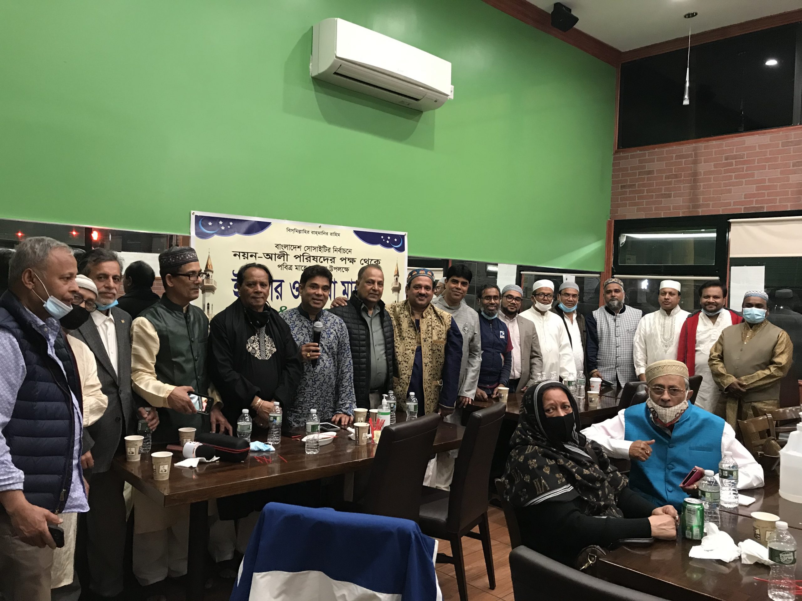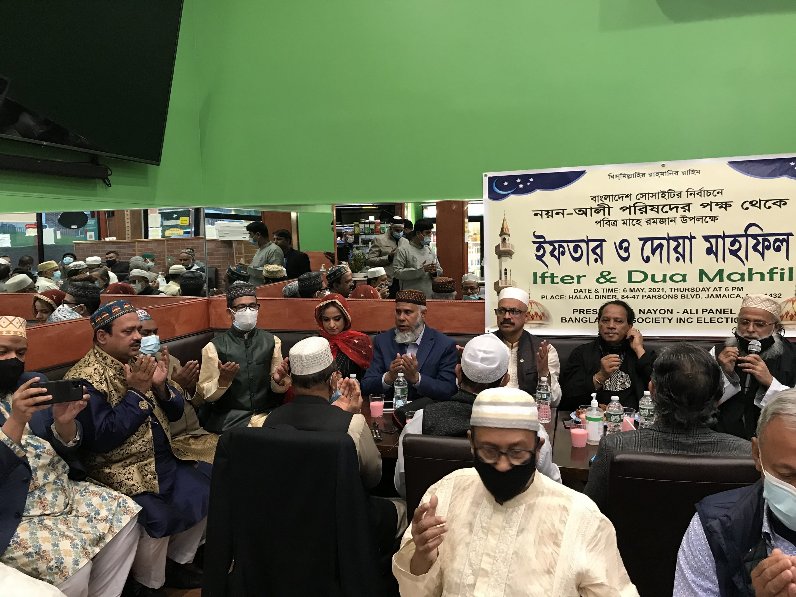 পবিত্র রমজান উপলক্ষ্যে গত ৬ মে বৃহস্পতিবার কুইন্সের পার্সন্স বুলেভার্ডস্থ হালাল ডাইনার রেষ্টুরেন্টে আয়োজিত ইফতার পার্টিতে সভাপতিত্ব করেন ‘নয়ন-আলী’ প্যানেলের নির্বাচন পরিচালনা কমিটির চেয়ারম্যান আবু নাসের। এতে বিশেষ অতিথি ছিলেন ষ্টেট অ্যাসেম্বীওম্যান জেনিফার রাজকুমার। অনুষ্ঠানের শুরুতে পবিত্র কোরআন থেকে তেলাওয়াত করেন আইটিভি ইউএসএ’র সিইও মাওলানা মুহাম্মদ শহীদুল্লাহ। প্যানেলটি থেকে সভাপতি পদপ্রার্থী কাজী আশরাফ হোসেন নয়ন সহ অন্যান্যের মধ্যে শুভেচ্ছা বক্তব্য রাখেন সোসাটির ভারপ্রাপ্ত সভাপতি আব্দুর রহীম হাওলাদার, সাবেক সাধারণ সম্পাদক মোহাম্মদ হোসেন খান, ফখরুল আলম ও রাব্বী মোহাম্মদ খোকন, সাবেক এমপি শহীদুর রহমান, ‘নয়ন-আলী’ প্যানেলের উপদেষ্টা আলী ইমাম, জালালাবাদ এসোসিয়েসন অব আমেরিকা’র সাবেক সভাপতি বদররুল খান, নর্থ বেঙ্গল ফাউন্ডেশনের সভাপতি ডা. আব্দুল লতিফ, সোসাইটির সাবেক সহ সভাপতি ফারুক হোসেন মজুমদার, করোনায় আক্রান্ত সোসাইটির সাবেক সহ সভাপতি কাজী আজহারুল হক মিলনের পুত্র কাজী জালাল। অনুষ্ঠান পরিচালনা করেন ‘নয়ন-আলী’ প্যানেলের সাধারণ সম্পাদক পদপ্রার্থী ও সোসাইটির কোষাধ্যক্ষ মোহাম্মদ আলী।