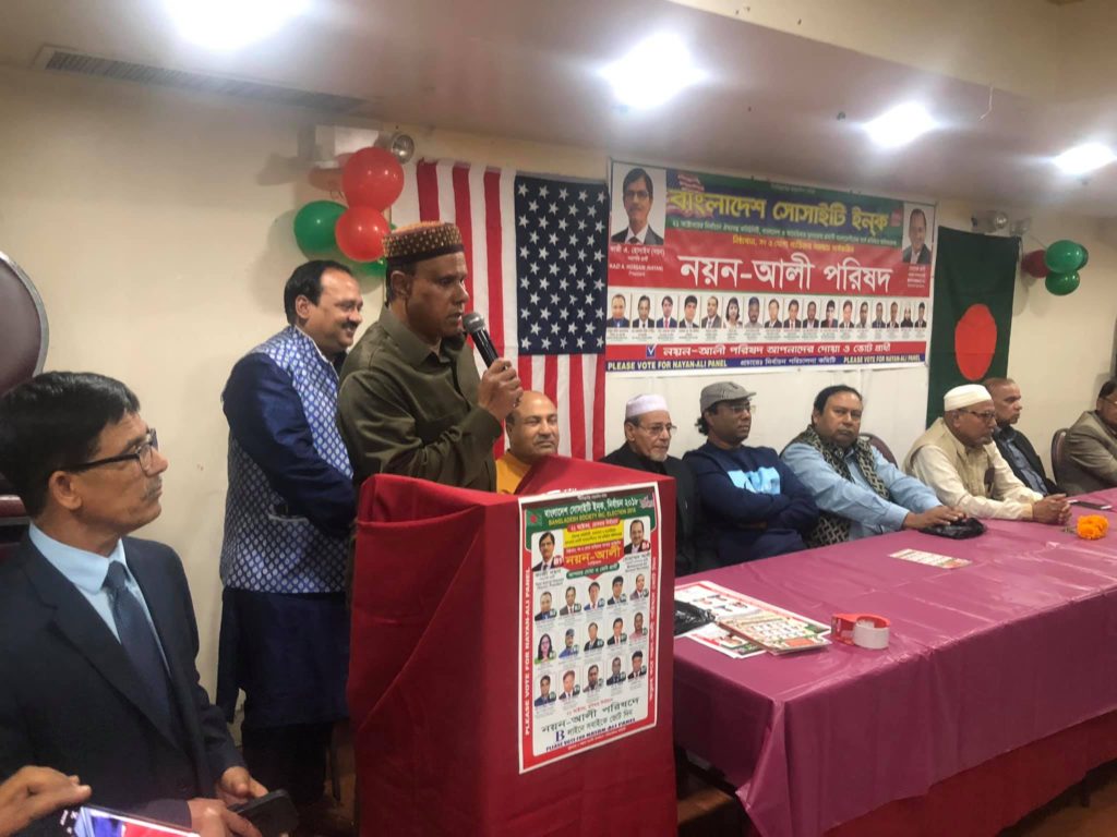 নিইয়র্ক সিটির জ্যাকসন হাইটসের পালকি পার্টি সেন্টারে গত ১৩ সেপ্টেম্বর শুক্রবার রাতে অনুষ্ঠিত নির্বাচনী সমাবেশে সভাপতিত্ব করেন নির্বাচন পরিচালনা কমিটির চেয়ারম্যান আবু নাসের। বাংলাদেশ সোসাইটির কোষাধ্যক্ষ ও সাধারণ সম্পাদক প্রার্থী মোহাম্মদ আলী এবং সাংস্কৃতিক সম্পাদক মনিকা রায়ের পরিচালনায় অন্যদের মধ্যে বক্তব্য রাখেন জালালাবাদ এসোসিয়েশন অব আমেরিকা ইনকের সাবেক ট্রাষ্টিবোর্ড সদস্য এলিমুজ্জামান নুনুই, রাজনীতিবিদ আলহাজ্ব সোলায়মান ভূইয়া, আবু তালেব চৌধুরী চান্দু, প্রিন্সিপাল ওয়াজি উল্লাহ, বাংলাদেশ সোসাইটির ট্রাষ্টিবোর্ড সদস্য আলী ইমাম শিকদার ও কাজী আজহারুল হক মিলন, নর্থ বেঙ্গল ফাউন্ডেশনের সভাপতি ডা. আবদুল লতিফ, প্রতিষ্ঠাতা সাধারণ সম্পাদক আবুল কাশেম, রাকিবুজ্জামান তনু, আশরাফ উদ্দিন, প্রফেসার রফিকুল ইসলাম, সভাপতি প্রার্থী কাজী আশরাফ হোসেন (নয়ন), সিনিয়র সহ সভাপতি প্রার্থী আব্দুর রহীম হাওলাদার, বিশিষ্ট ব্যবসায়ী আহসান হাবিব, কমিউনিটি এক্টিভিস্ট ফারুক হোসেন মজুমদার, আবদুর রব দলা মিয়া, কফিল চৌধুরী, আবদুল মান্নান, আবদুল মালেক, গৌস খান, জাহাঙ্গীর সরকার, নাসিম আহমেদ, কাজী কামাল, জুনেদ আহমেদ চৌধুরী, মাহবুব আলম, একেএম আবদুর রশিদ, ইউনুস সরকার, আখতার হোসেন, নাসিম আহমেদ, বৃহত্তর রাজশাহী সমিতির সাধারণ সম্পাদক মোজাফ্ফর হোসেন, মিয়া আলীম পাখী, জাবেদ উদ্দিন, মেহেদী আমান বাবু, সফিক উদ্দিন দুলাল, বাবলি হক, মওলানা ফখরুল ইসলাম মাসুম, মামুন মিয়াজী, কে ভূইয়া, আহসান উল্লাহ বাচ্চু, জাকির হোসেন, তানভীর করিম, এমএ মুহিত, হাসান প্রমুখ। সভার শুরুতে পবিত্র কোরআন থেকে তেলাওয়াত করেন আমানত হোসেন আমান। সমাবেশে কর্মী সমর্থকরা ছাড়াও কমিউনিটির গণ্যমান্য ব্যক্তিবর্গসহ বিপুল সংখ্যক প্রবাসী উপস্থিত ছিলেন।