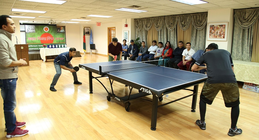 গত বছরের ন্যায় এবারও মহান বিজয় দিবস উপলক্ষ্যে ১৫ ডিসেম্বর স্থায়ী মিশনের বঙ্গবন্ধু মিলনায়তনে ‘বিজয় দিবস প্রীতি টেবিল টেনিস টুর্ণামেন্ট’ এর আয়োজন করা হয়। স্থায়ী মিশন ও কনস্যুলেট জেনারেলের কর্মকর্তা-কর্মচারি, জাতিসংঘ সদরদপ্তরে কর্মরত বাংলাদেশের সামরিক বাহিনীর কর্মকর্তাগণ এবং বিপুল সংখ্যক প্রবাসী বাংলাদেশী এই টেবিল টেনিস টুর্ণামেন্টে অংশ নেন। উৎসবমূখর পরিবেশে বিপুল প্রবাসীদের সমাগমে অনুষ্ঠিত এই টুর্ণামেন্টে যৌথভাবে চ্যাম্পিয়ন হন মোকাররাম আহমেদ ও মেজর মো: আলতাফ আলী এবং এককভাবে চ্যাম্পিয়ন হন মো: আসিফ চৌধুরী। ১৬ ডিসেম্বর আলোচনা অনুষ্ঠান শেষে বিজয়ীদের মাঝে ‘বিজয় দিবস টেবিল টেনিস ক্রেস্ট’ পুরস্কার প্রদান করা হয়।
