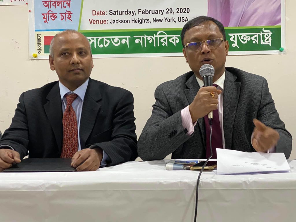 সংবাদ সম্মেলনে লিখিত বক্তব্য পাঠ করেন সচেতন নাগরিক সমাজ, যুক্তরাষ্ট্র’র মোকশেদ আর ভূইয়া। অন্যদের মধ্যে বক্তব্য রাখেন যুক্তরাষ্ট্র যুব দলের সভাপতি জাকির এইচ চৌধুরী, এটিএম হেলালুর রহমান, ডা. জিয়াউল হক, রাশেদা আহমেদ মুন প্রমুখ।