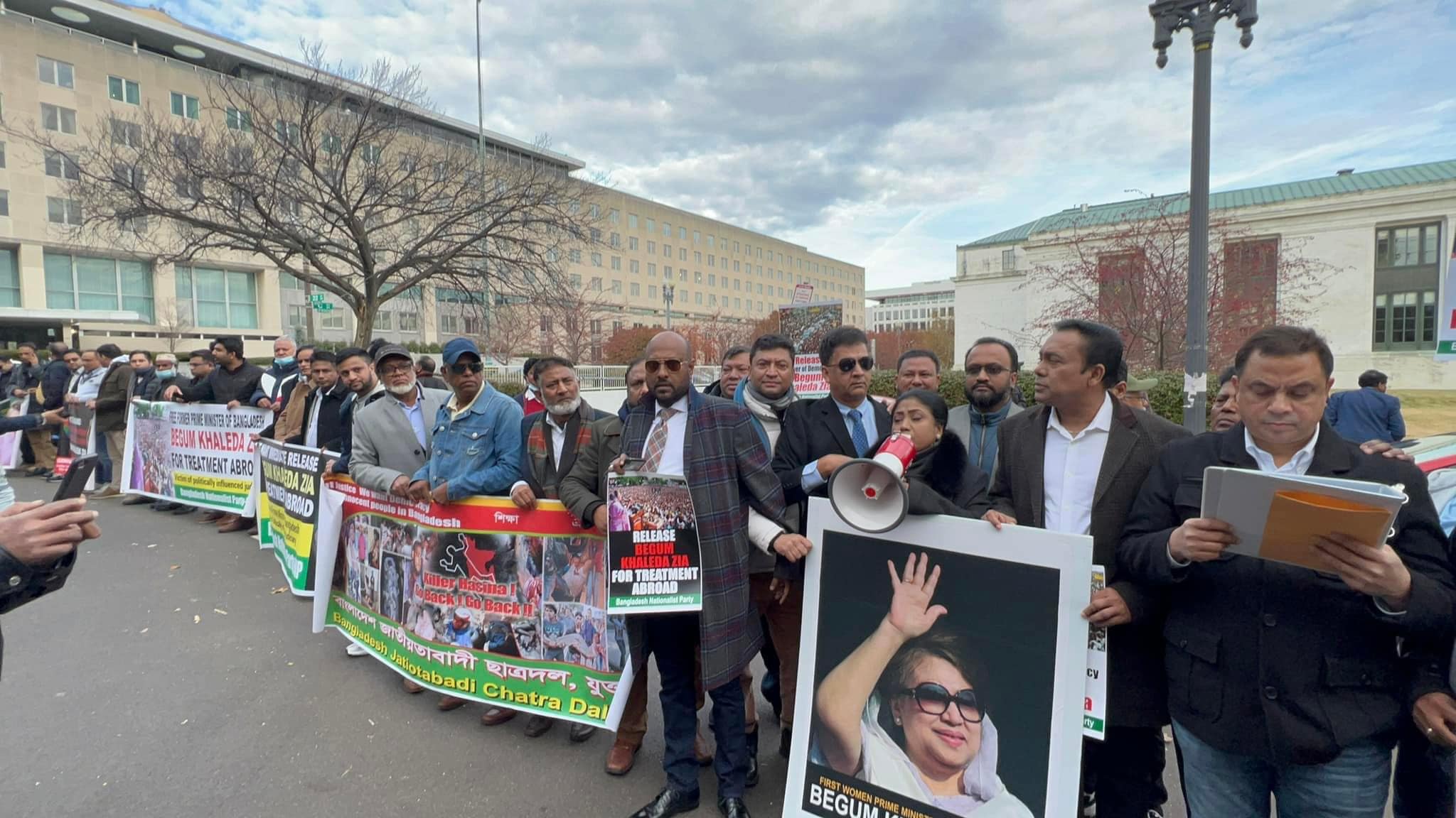 নেতা-কর্মীরা রিলিজ খালেদা জিয়া, ফ্রী ডেমোক্রেসি ইন বাংলাদেশ ইত্যাদি শ্লোগান দেয় মার্কিন স্টেট ডিপার্টমেন্ট ও হোয়াইট হাউসের সামনে।