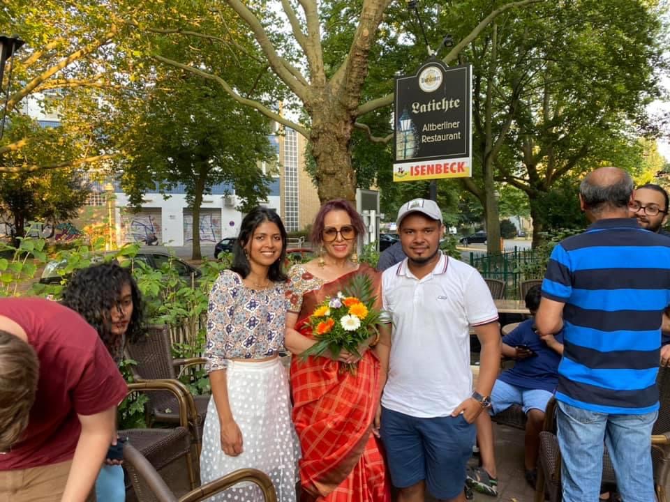 বহু বছর আগে এদেশে কলোনে যখন চাকুরী নিয়ে আসি তখন মাঝে মাঝে বার্লিনে সাংস্কৃতিক অনুষ্ঠানে অংশ নেওয়ার জন্য আমন্ত্রিত হয়ে আসতাম। সে সময় থেকেই অর্থাৎ দীর্ঘ দিনের পরিচয় বাবুল, সানু, মিলনের সঙ্গে। এবার ঢাকা থেকে ফেরার পর এই প্রথম তাঁদের সঙ্গ পেলাম। রাসেল দেশে অধ্যাপনা করতেন এখন বার্লিনবাসী, সস্ত্রীক নতুন জীবনে ব্যাসত — আসাদ বার্লিনে দীর্ঘদিন বসবাসের পর দেশে ফিরে গিয়ে নির্দিষ্ট কিছু প্রোজেকটে কাজ করছেন —- বার্লিনে এসেছেন —- তিনিও এসেছিলেন সেদিন। অনেকের সঙ্গেই আনন্দঘন সময় কাটলো।