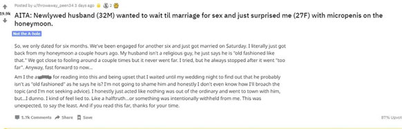 অনলাইন প্যাল্টফর্ম রেডিটে তিনি লিখেছেন তার অভিজ্ঞতার কথা ৷ একেবারে স্পষ্ট করেছেন তার বক্তব্য ৷ তার স্বামীর সঙ্গে ৬ মাস তিনি ডেট করেছেন ৷ তারপর কেটেছে আরও ৬ মাস ৷ তার মধ্যে অনেক সময়ই তিনি শারীরিক মিলনে ইচ্ছুক থাকলেও তার সঙ্গী তাকে আটকেছে, এই বলে যে তিনি পুরনোপন্থী ৷ তাই বিয়ের আগে কোন যৌন সঙ্গমে যেতে চান না…তবে এইগুলো যে পুরোটাই মিথ্যে তা তিনি বিয়ের পর বুঝতে পারলেন.মধুচন্দ্রিমায় গিয়ে স্বামীর এই দুর্বলতা ধরতে পারেন ৷ এবং তখন বুঝতে পারেন যে কেন তার স্বামী বিয়ের আগে কোন যৌন মিলন চাইতেন না ৷ এতেই মহিলা ক্ষুদ্ধ হয়েছেন এবং মনে করছেন যে তিনি ঠকেছেন ৷