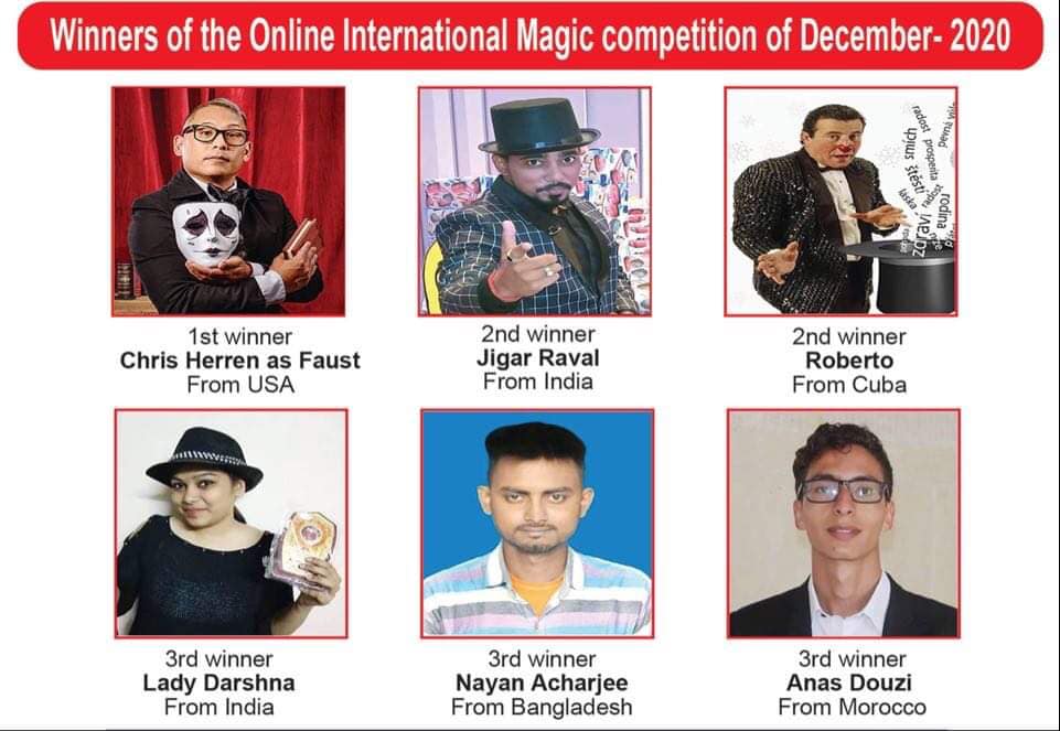 ইউএসএনিউজঅনলাইন.কম. ডেস্ক. নিউইয়র্ক: মুজিব জন্ম শতবার্ষিকীকে সামনে রেখে নিউইয়র্কস্থ বাংলাদেশ আমেরিকা ম্যাজিক সোসাইটি, বাংলাদেশের ইন্টারন্যাশনাল ব্রাদারহুড অব ম্যাজিশিয়ান্স (রিং-২৭৯) এবং ইন্ডিয়া আমেরিকা ম্যাজিক সোসাইটির উদ্যোগে করোনার ক্রান্তিলগ্নেœ কর্মহীন জাদুশিল্পীদের উৎসাহ প্রদানের উদ্দেশ্যে প্রতিমাসে আমেরিকা থেকে ভার্চুয়াল জাদু প্রতিযোগিতা চলমান রয়েছে। গত বছরের জুলাই, আগষ্ট ও সেপ্টেম্বর এই ৩ মাস শুধু বাংলাদেশের জাদুশল্পীদের মধ্যে এ প্রতিযোগিতা অনুষ্ঠিত হয়েছে। এরই ধারাবাহিকতায় অক্টোবর মাস থেকে এটি সারা পৃথিবীর প্রতিযোগিদের জন্য উন্মুক্ত করে দেয়া হয়েছে। ডিসেম্বর মাসে অনলাইন ইন্টারন্যাশনাল ম্যাজিক কম্পিটিশন (Online International Magic Competition) ফেসবুক গ্রুপে আয়োজিত বিশ্ব জাদু প্রতিযোগিতায় ১৩ টি দেশের মোট ৫৩ জন জাদুশিল্পী অংশগ্রহন করেন। ডিসেম্বর মাসের প্রতিযোগিতায়: ১ম হয়েছেন আমেরিকান জাদুশিল্পী ক্রিস হ্যরেন ফাউস্ট। ২য় হয়েছেন ২ জন: ভারতীয় জাদুশিল্পী জিগার রাভেল এবং কিউবার জাদুশিল্পী রোবারতো। আর ৩য় হয়েছেন ৩ জন: ভারত থেকে মিস দর্শনা, বাংলাদেশের নয়ন আচার্য্য এবং মরক্কোর আনাচ দাউচী।