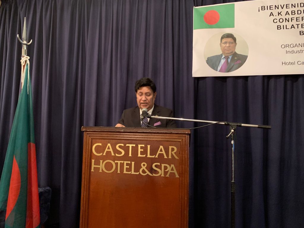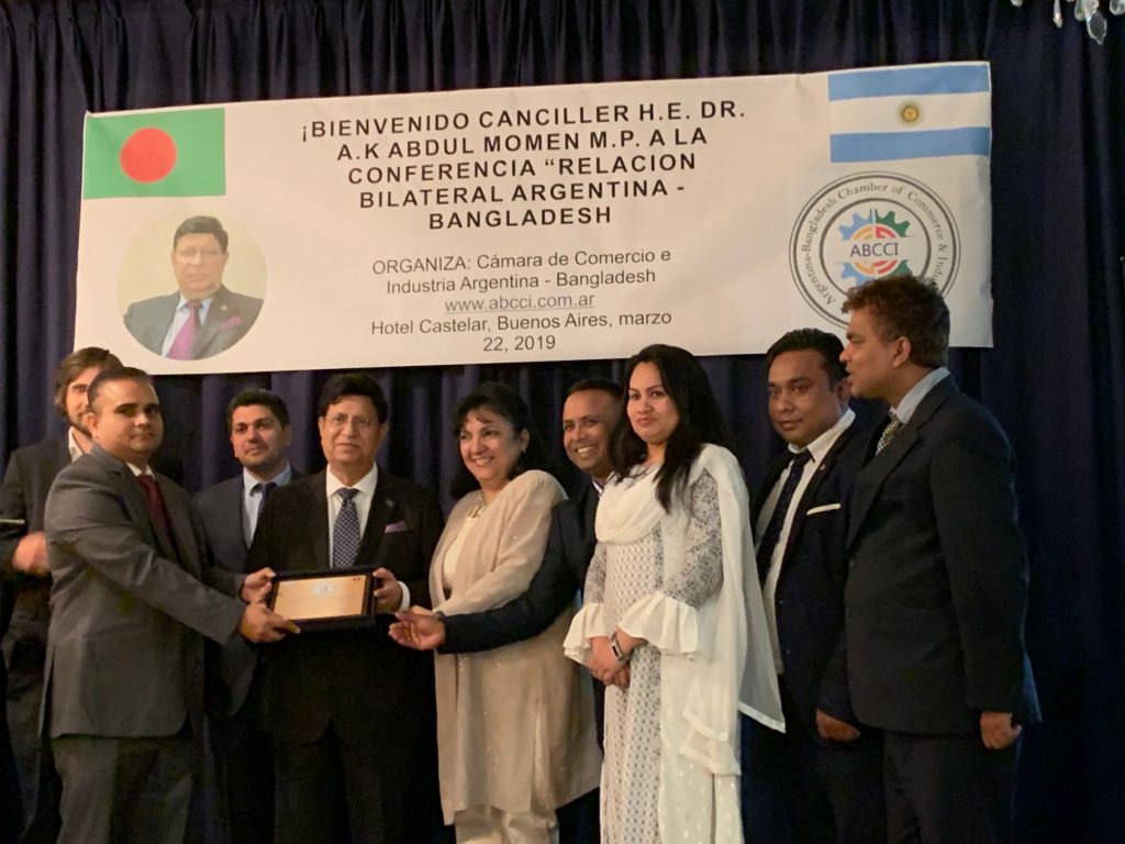 ইউএসএনিউজঅনলাইন.কম ডেস্ক, বুয়েনস আয়ারস্ : বুয়েনস্ আইরেস মহানগরীর ক্যাস্টেলার হোটেলে ২২ মার্চ ‘আর্জেন্টিনা বাংলাদেশ চেম্বার অব কমার্স এন্ড ইন্ডাস্ট্রি (এবিসিসিআই)’ আয়োজিত এক সংবর্ধনা সভায় যোগ দেন বাংলাদেশের পররাষ্ট্রমন্ত্রী ড. এ. কে. আব্দুল মোমেন এমপি। বাংলা, স্প্যানিস ও ইংরেজি ভাষার মেলবন্ধনে বহুজাতিক ও বহুভাষিক সংস্কৃতির আবহে এবিসিসিআই আয়োজিত এই সংবর্ধনা অনুষ্ঠান পরিণত হয় বুয়েনস্ আইরেসে বসবাসরত প্রবাসী বাঙালি ও আর্জেন্টিনাবাসীর এক মিলন মেলায়। উদ্বোধনী বক্তব্য রাখেন সংস্থাটির ভাইস প্রেসিডেন্ট মার্গারেট পিকোরা।