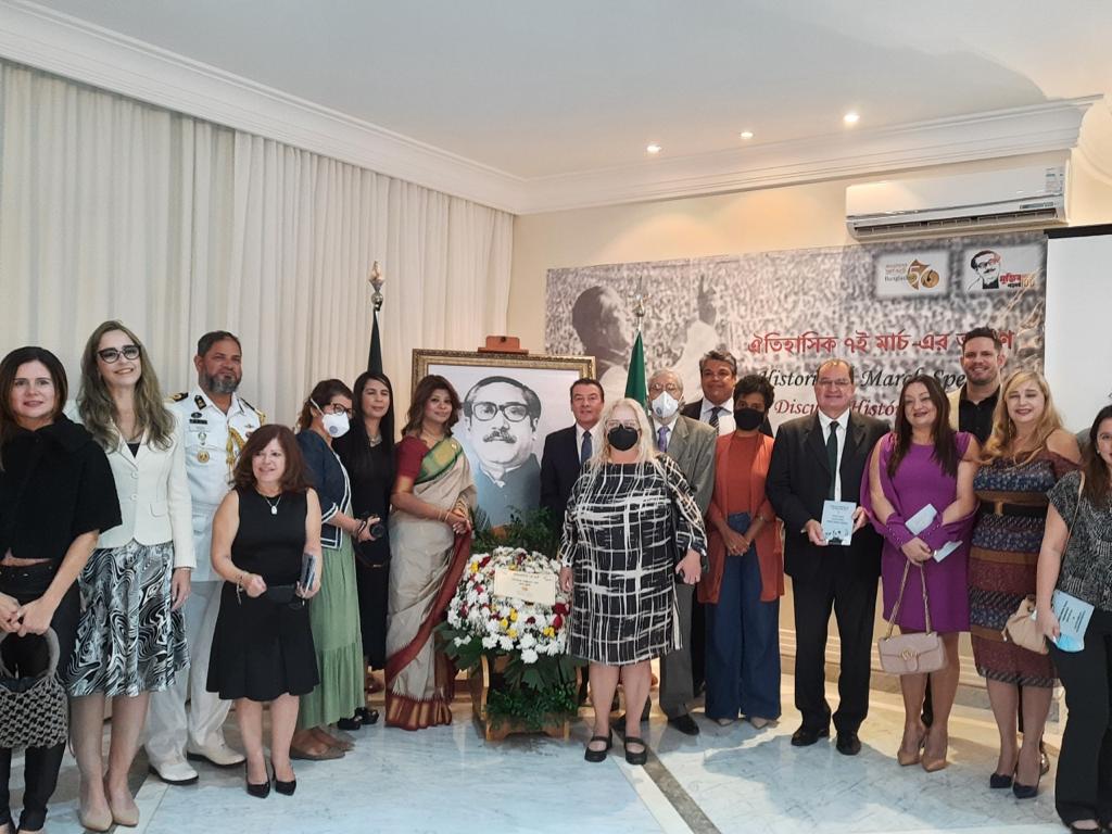 ০৫. অনুষ্ঠানের শেষ অংশে বঙ্গবন্ধুর ৭ মার্চের ভাষণ এর ভিডিও প্রাচারিত সমাগত সুধীবৃন্দ আবেগাপ্লুত হয়ে পড়েন। ভাষাগত প্রতিবন্ধকতা সত্ত্বেও ভাষণের ঝংকার উপস্থিত ব্রাজিলীয় নাগরিকদেরও স্পর্শ করে। বঙ্গবন্ধুর ভাষণ ইংরেজি সাব-টাইটেলসহ প্রচারের পাশাপাশি ভিন্ন একটি প্রজেক্টরে ভাষণটির ব্রাজিলীয় পর্তুগীজ অনুবাদও প্রদর্শিত হয়। উল্লেখ্য বঙ্গবন্ধু-র ৭ই মার্চের ভাষণ ব্রাজিলীয় পর্তুগীজ ভাষায় অনুবাদ করে পুস্তিকা আকারে প্রকাশ করা হয় এবং উপস্থিত সাংবাদিকদের উপহার হিসেবে তা প্রদান করা হয়।