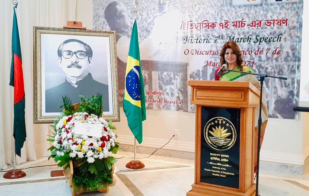 ০২. দিবসটি উপলক্ষ্যে দূতাবাসে দিনব্যাপী কর্মসূচির আয়োজন করা হয়। ৭ই মার্চ সকালে দূতাবাস প্রাঙ্গনে রাষ্ট্রদূত সাদিয়া ফয়জুননেসা কর্তৃক জাতীয় সঙ্গীতের সাথে জাতীয় পতাকা উত্তোলনের মাধ্যমে দিবসটি উদযাপন শুরু হয়। ৭ মার্চ সন্ধায় ব্রাজিলের প্রথম সারির প্রায় সকল পত্রিকার সাংবাদিকদের উপস্থিতিতে আলোচনা সভার আয়োজন করা হয়। উল্লেখ্য, এ অনুষ্ঠানে প্রায় ৩০ জন ব্রাজিলীয় সাংবাদিক উপস্থিত ছিলেন। ঐতিহাসিক এ দিবস উপলক্ষ্যে দূতাবাসে বঙ্গবন্ধুর জীবন ও কর্মের উপর আলোকচিত্র প্রদর্শন করা হয়।