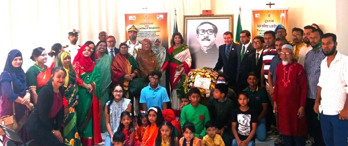 ০২.       সকাল দশটায় জাতীয় সঙ্গীতের সাথে মান্যবর রাষ্ট্রদূত কর্তৃক জাতীয় পতাকা উত্তোলনের মাধ্যমে সূচিত এ অনুষ্ঠানের শুরুতেই জাতির পিতা বঙ্গবন্ধু শেখ মুজিবুর রহমানসহ মুক্তিযুদ্ধে আত্মত্যাগকারী সকল শহীদ এবং সম্ভ্রমহারা মা-বোনদের প্রতি শ্রদ্ধা নিবেদন করে এক মিনিট নিরবতা পালন করা হয়। এরপর রাষ্ট্রদূত সাদিয়া ফয়জুন্নেসা উপস্থিত সকলকে সাথে নিয়ে জাতির পিতার প্রতিকৃতিতে পুষ্পস্তবক অর্পণ করেন। দিবসটির তাৎপর্য তুলে ধরে বাংলাদেশের রাষ্ট্রপতি, প্রধানমন্ত্রী, পররাষ্ট্রমন্ত্রী এবং পররাষ্ট্র প্রতিমন্ত্রী প্রদত্ত বাণী পাঠ করা হয়। এরপর বঙ্গবন্ধুসহ মুক্তিযুদ্ধের সকল শহীদ, ১৫ আগষ্টে নির্মম হত্যাকান্ডে নিহত বঙ্গবন্ধু পরিবারের সকল সদস্যের আত্মার মাগফেরাত এবং বাংলাদেশের ক্রমঅগ্রসরমান আর্থ-সামাজিক উন্নয়নের অব্যাহত অগ্রযাত্রা কামনা করে বিশেষ প্রার্থনা করা হয়।
