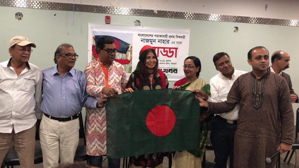 ইউএসএনিউজঅনলাইন.কম ডেস্ক, নিউইয়র্ক : বাংলাদেশের এক সাহসী নারী নাজমুন নাহার। বিশ্বের আনাচে-কানাচে বাংলাদেশকে পরিচিত করতে দূর্গম পাহাড়-জঙ্গল পেরিয়ে দেশের পতাকা বহন করে ইতোমধ্যে ঘুরেছেন ১৩০ টি দেশ। অদম্য মানসিক শক্তিকে পুঁজি করে তিনি এগিয়ে যাচ্ছেন। বিভিন্ন দেশ ভ্রমণ প্রসঙ্গে তিনি বলেছেন, ভ্রমণে ভিসা নয়, আমি গুরুত্ব দেই লাল-সবুজের পতাকাকে। মানুষ চাঁদে গেছে পতাকা হাতে। সাহসী এ নারীর সাথে এক আড্ডা অনুষ্ঠানের আয়োজন করে বাংলাখবর ডট নেট। ২৮ আগস্ট বুধবার নিউইয়র্কের জ্যাকসন হাইটস এলাকায় খাবার বাড়িতে আয়োজিত এ আড্ডায় নাজমুন নাহার বলেন এসব কথা। বাংলা খবর ডট নেট এর সম্পাদক শওকত ওসমান রচি’র সভাপতিত্বে অনুষ্ঠান সঞ্চালন করেন এ অন লাইন পত্রিকার ব্যবস্থাপনা সম্পাদক সৈয়দ মোস্তফা আল আমিন।