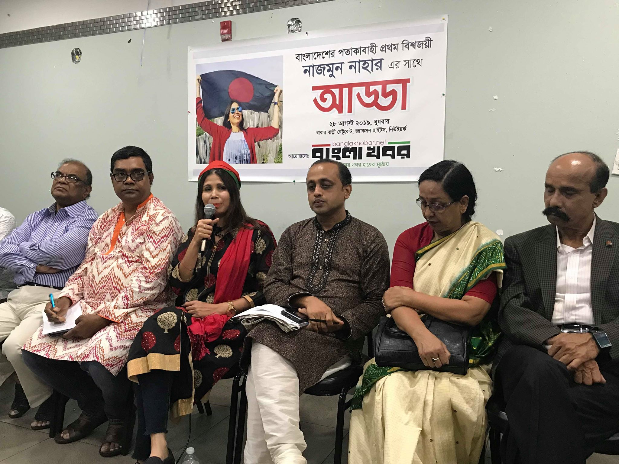 আড্ডায় অংশগ্রহণকারিরা তন্ময় হয়ে শোনেন নাজমুন নাহারের বিশ্ব অভিযানের অভিজ্ঞতা। বিপদ সংকুল পরিস্থিতিতে তার এ দু:সাহসিক অভিযানের সময় নানান প্রতিকূল অবস্থা কিভাবে প্রতিহত করে বাংলাদেশের জাতীয় পতাকা হাতে ঘুরেছেন তার বর্ণনা করেন। আড্ডায় উপস্থিত ছিলেন নিউইয়র্কে প্রবাসী সিনিয়র সাংবাদিক, বিভিন্ন সপ্তাহিক পত্রিকার সম্পাদক, মুক্তিযোদ্ধা সহ বিভিন্ন পেশার মানুষ। নাজমুন নাহারের প্রায় একঘন্টা টানা অভিজ্ঞতার বর্ণনা শেষে তারা নানান প্রশ্ন করেন তাকে। আড্ডার শুরুতে নাজমুন নাহারের বড় ভাই আমিনুল ইসলাম স্মরণে এক মিনিট নীরবতা পালন করা হয়। অনুষ্ঠানের এক পর্যায়ে বাংলা খবর ডট নেট এর পক্ষ থেকে নজমুন নাহারের হাতে বাংলাদেশের জাতীয় পতাকা তুলে দেন অতিথিরা।