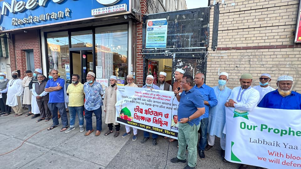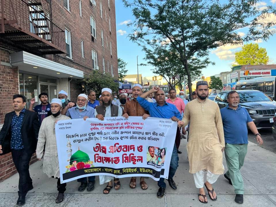 ইউএসএনিউজঅনলাইন.কম : মহানবী হজরত মুহাম্মদ (সা.) ও হজরত আয়েশা (রা.) কে নিয়ে ভারতের ক্ষমতাসীন দল বিজেপির মুখপাত্র (সাসপেন্ডেড) নূপুর শর্মা ও দিল্লি শাখার গণমাধ্যম প্রধান নবীন কুমার জিন্দালের অবমাননাকর মন্তব্যের তিব্র নিন্দা ও প্রতিবাদ জানিয়েছে বাংলা ক্লাব নিউইয়র্ক, ইউএসএ। এউপলক্ষে নিউইয়র্কে ব্রঙ্কসের নিরব রেস্টুরেন্টের সামনে ৯ জুন বৃহস্পতিবার সংগঠনটি বিক্ষোভ সমাবেশ ও মিছিল করেছে। খবর ইউএসএনিউজঅনলাইন’র।