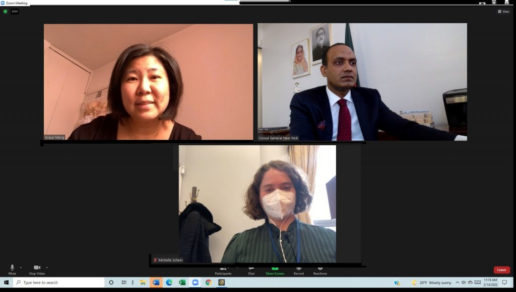 ইউএসএনিউজঅনলাইন.কম ডেস্ক, নিউইয়র্ক : নিউইয়র্কস্থ বাংলাদেশ কনস্যুলেট জেনারেল এর নবনিযুক্ত কনসাল জেনারেল ড. মোহাম্মদ মনিরুল ইসলাম এবং কংগ্রেসওম্যান গ্রেস মেং এর মধ্যে আজ ১৪ ফেব্রুয়ারী ২০২২ ভার্চুয়াল মাধ্যমে এক বৈঠক অনুষ্ঠিত হয়। কংগ্রেসওম্যান গ্রেস মেং ড. ইসলামকে স্বাগত জানিয়ে তাঁর নিউইয়র্কে কর্মকালীন সময়ের সফলতা কামনা করেন।