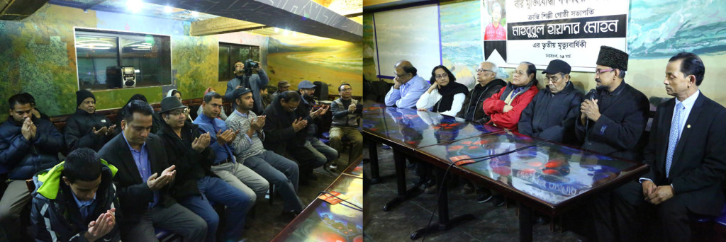 এর আগে অনুষ্ঠানের শুরুতে মাহবুবুল হায়দার মোহনের বর্ণাঢ্য জীবনের উপর নির্মিত মিনহাজ আহমেদ শাম্মু’র বিশেষ ভিডিও প্রদর্শনী সমবেত সুধিজনকে শিল্পীর জীবন এবং কর্ম সম্বন্ধে অনেক অজানা তথ্য জানায়। এক মিনিট নীরবতা পালন শেষে মৌলানা মোহাম্মদ আবদুল কাইউম এর পরিচালনায় বিশেষ দোয়া অনুষ্ঠিত হয়। খ্যাতনামা অভিনেত্রী রেখা আহমেদ তাঁর আবেগময় বক্তব্যে বলেন, মোহনদের কখনো মৃত্যু হয়না, তার আত্মা নিশ্চয়ই আমাদের আশেপাশেই ঘুরে বেড়াচ্ছে। তিনি ক্রান্তির যুক্তরাষ্ট্র শাখা গঠন নিয়ে শিল্পী মোহনের সাথে কথাবার্তার স্মৃতিচারণও করেন। সংগীত পরিচালক নাদিম আহমেদ বিশ্ব সাহিত্য কেন্দ্র নিউ ইয়র্ক আয়োজিত মাহবুবুল হায়দার মোহনের একক অনুষ্ঠানে উপস্থিত থাকার কথা স্মরণ করে বলেন, তাঁর সেদিনকার প্রানবন্ত পরিবেশনা এখনো মনের ভেতর গেঁথে আছে। জনাব নাদিম শিল্পী মোহনের বিভিন্ন মৌলিক সৃষ্টির যথাযথ রক্ষনাবেক্ষনের উপর বিশেষ গুরুত্ব আরোপ করেন। প্রবীন সাংবাদিক মনজুর আহমেদ বলেন, সময়ের প্রয়োজনেই যুগে যুগে মোহনদের আবির্ভাব হয়ে থাকে। ব্যক্তিগত ভাবে চেনার অনেক আগে থেকেই তাকে চিনতাম তার সকল মহৎ কর্মকাণ্ডের মাধ্যমে। ঢাকার রাজপথ, শহীদ মিনার কিংবা মুক্তমঞ্চের মতো স্থানগুলো ছিল শিল্পী এবং বিপ্লবী মোহনের আসল ঠিকানা। স্বাধীন বাংলা বেতারের কণ্ঠযোদ্ধা এবং খ্যাতনামা কণ্ঠশিল্পী শহীদ হাসান শিল্পী মোহনের কথা বলতে গিয়ে বরাবরের মতোই আবেগে আপ্লুত হন। তাঁর লেখা