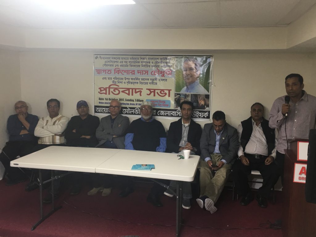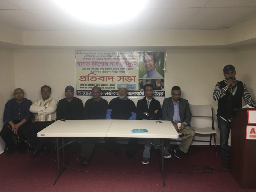 নিউইয়র্কে ব্রঙ্কসের স্টারলিং-বাংলাবাজার এলাকার এশিয়ান ড্রাইভিং স্কুল হলে স্থানীয় সময় ১ অক্টেবর রোববার রাতে মৌলভীবাজার জেলাবাসী নিউইয়র্ক আয়োজিত এই প্রতিবাদ সমাবেশে যুক্তরাষ্ট্র মৌলভীবাজার প্রবাসীরা ছাড়াও বিভিন্ন পেশাজীবী, সামাজিক ও সাংস্কৃতিক সংগঠনের নের্তৃবৃন্দসহ বিপুলসংখ্যক প্রবাসী বাংলাদেশি অংশ নেন।