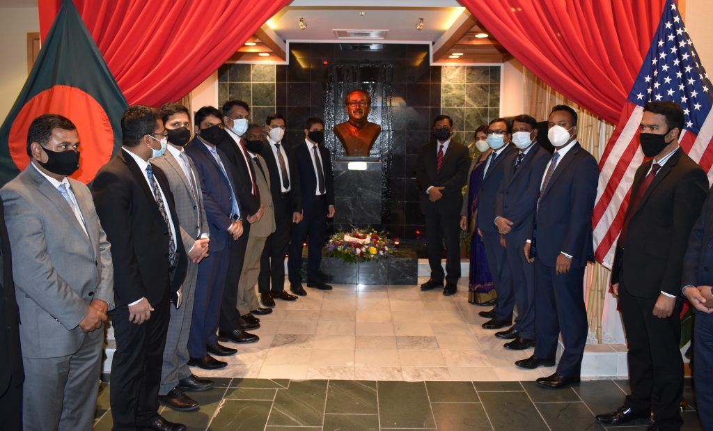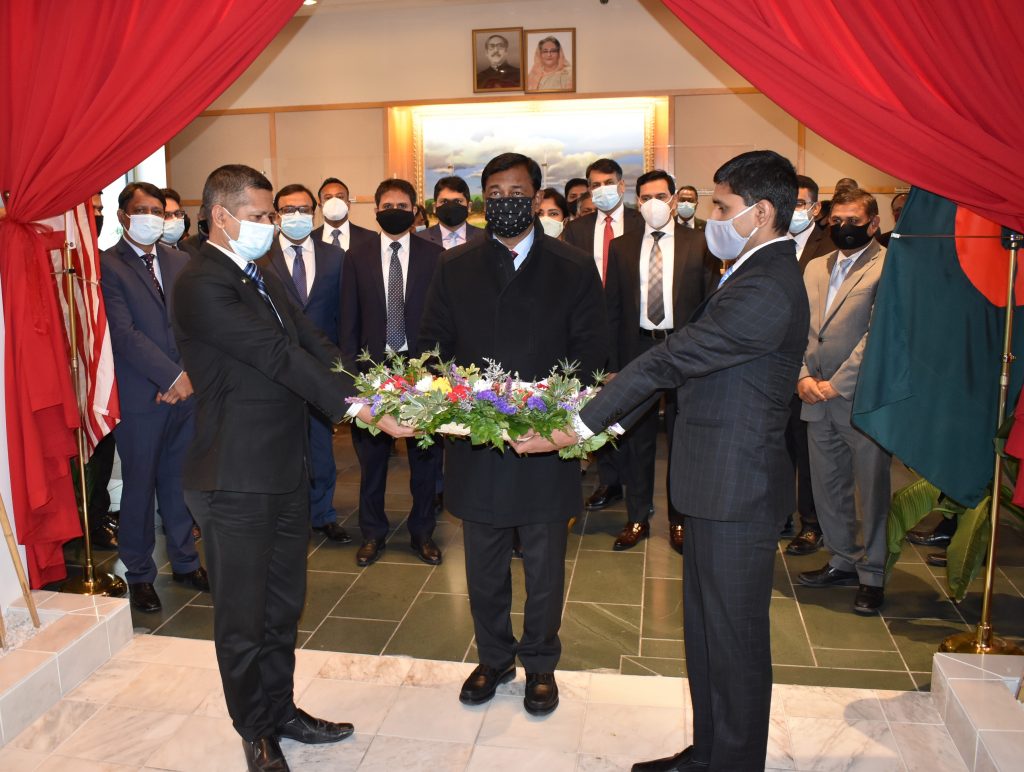 দূতাবাসে আগমনের পর রাষ্ট্রদূত জাতির জনক বঙ্গবন্ধু শেখ মুজিবুর রহমানের আবক্ষ মূর্তিতে পুষ্পস্তবক অর্পণ করেন।
