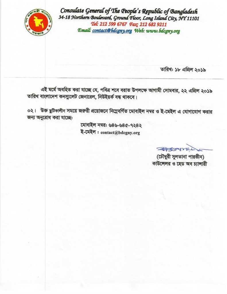 এদিকে, পবিত্র শবেবরাত উপলক্ষে যুক্তরাষ্ট্রে দূতাবাস ও কনস্যুলেট বন্ধ ঘোষণা করা হয়েছে আগামী ২২ এপ্রিল সোমবার।