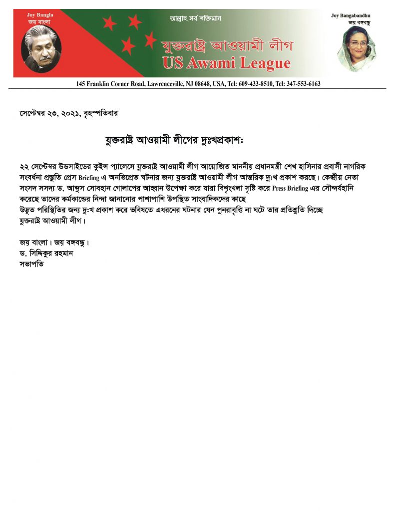 ওই প্রেস বিজ্ঞপ্তিতে তিনি উল্লেখ করেন, কেন্দ্রীয় নেতা সংসদ সসদ্য ড. আব্দুস সোবহান গোলাপের আহ্বান উপেক্ষা করে যারা বিশৃংখলা সৃষ্টি করে এর সৌন্দর্যহানি করেছে তাদের কর্মকান্ডের নিন্দা জানানোর পাশাপাশি উপস্থিত সাংবাদিকদের কাছে উদ্ভূত পরিস্থিতির জন্য দু:খ প্রকাশ করে ভবিষ্যতে এধরনের ঘটনার যেন পুনরাবৃত্তি না ঘটে তার প্রতিশ্রুতি দিচ্ছে যুক্তরাষ্ট্র আওয়ামী লীগ।