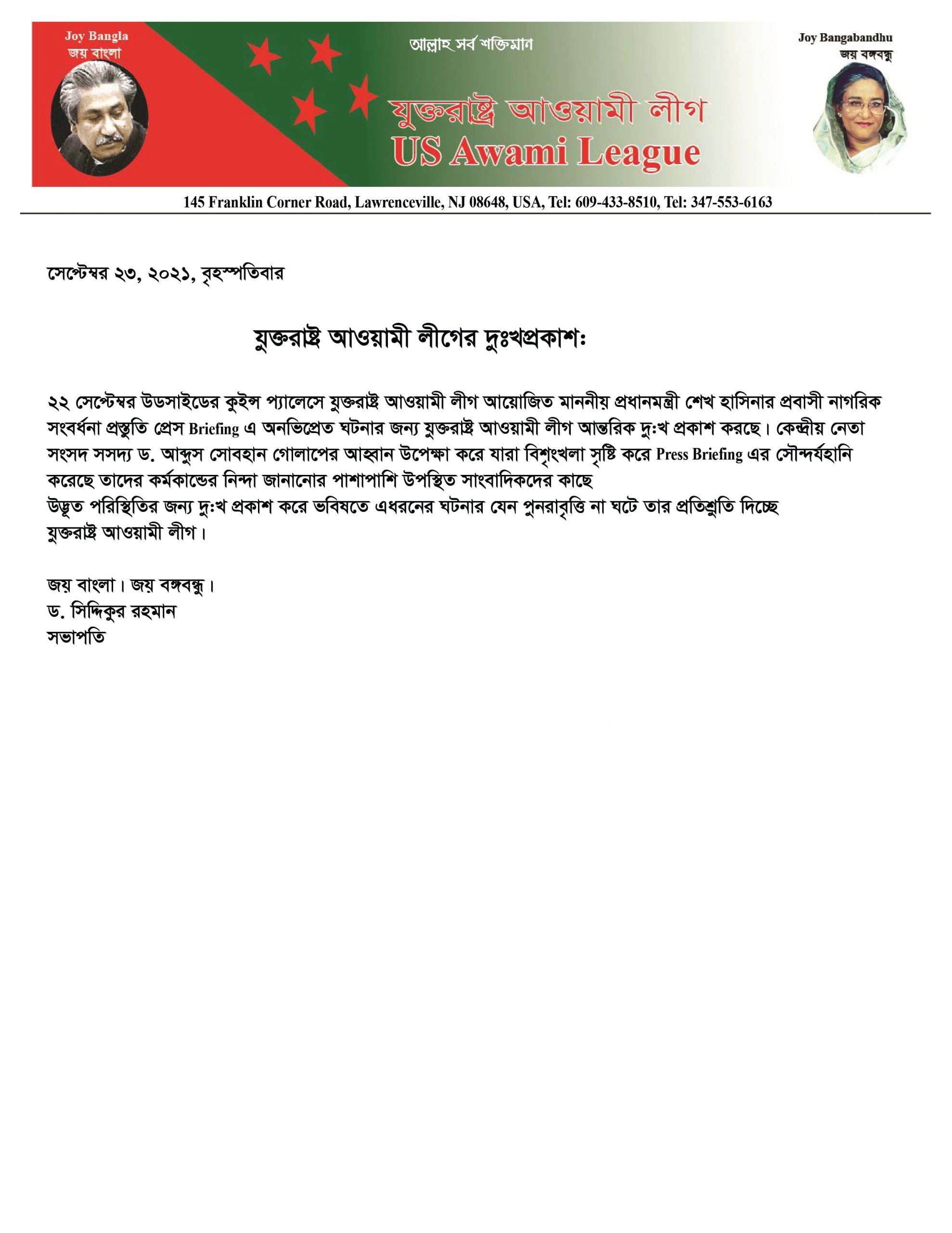 যুক্তরাষ্ট্র আওয়ামী লীগের দুঃখ প্রকাশ