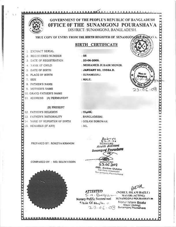 পিতা মনির হোসেনের জন্ম সনদ, যুক্তরাষ্ট্রে তার ন্যাচারালঅইজেশন সনদ ও পাসপোর্টের কপি আল জাজিরাকে দেখান শ্রাবণ। ওই পাসপোর্টে দেখা যায়, জুবাইর মনিরের জন্ম ১৯৫৮ সালের ৩রা জানুয়ারি। যুদ্ধ যখন শুরু হয় তখন তার বয়স ছিল মাত্র ১৩ বছর। এ নিয়ে শ্রাবণ প্রশ্ন তোলেন। জানতে চান, যখন তার বয়স ১৩ বছর তখন কিভাবে সে যুদ্ধাপরাধ করতে পারে?
