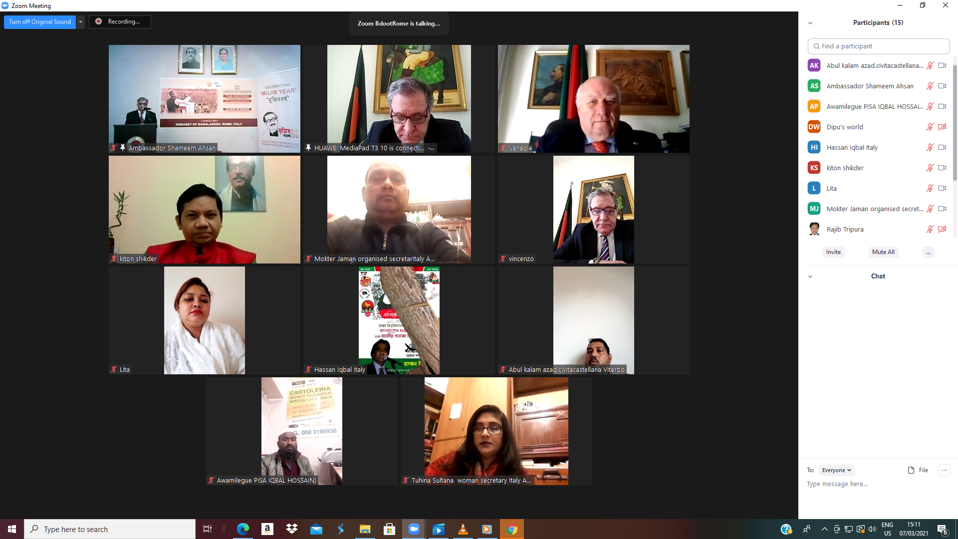 ইতালি প্রবাসী বাংলাদেশী রাজনৈতিক, সামাজিক-সাংস্কৃতিক নেতৃবৃন্দ, সাংবাদিক ছাড়াও বিদেশী নাগরিকগণের অংশগ্রহণে একটি প্রাণবন্ত আলোচনা সভায় ইতালির কাতানিয়া ও পালেরমো শহরে নিযুক্ত বাংলাদেশের অনারারি কনসাল জেনারেল যথাক্রমে এডভোকেট জোভান্নি ভানাদিয়া (Adv. Giovanni Vanadia) এবং ভিসেনজো দি তান্তো (Mr. Vincenzo Di Tanto) ঐতিহাসিক এই দিনটি উপলক্ষে তাদের শুভেচ্ছা বক্তব্য প্রদান করেন। এছাড়া রোমস্থ প্রখ্যাত লা সাপিয়েঞ্জা (La Sapienza) বিশ্ববিদ্যালয়ের সহকারী অধ্যাপক মারা মাত্তা (Mara Matta) লিখিত বার্তার মাধ্যমে বঙ্গবন্ধুর এই ভাষণকে বাঙ্গালি জাতির স্বাধীনতার দিক নির্দেশক হিসেবে উল্লেখ করেন। আলোচকগণ ৭ই মার্চের ভাষণকে বাংলাদেশের ইতিহাসের একটি অনন্যসাধারণ ঘটনা হিসেবে উল্লেখ করেন। প্রবাসীদের কল্যাণে দূতাবাস কর্তৃক গৃহীত সাম্প্রতিক কার্যক্রমের জন্যও বক্তারা দূতাবাসকে ধন্যবাদ জানান। উল্লেখ্য, আলোচনা সভায় ইতালি প্রবাসী ছাড়াও ইউরোপের অন্যান্য দেশে বসবাসকারী এবং বর্তমানে বাংলাদেশে অবস্থানকারী প্রবাসী বাংলাদেশিরা অংশগ্রহণ করেন।
