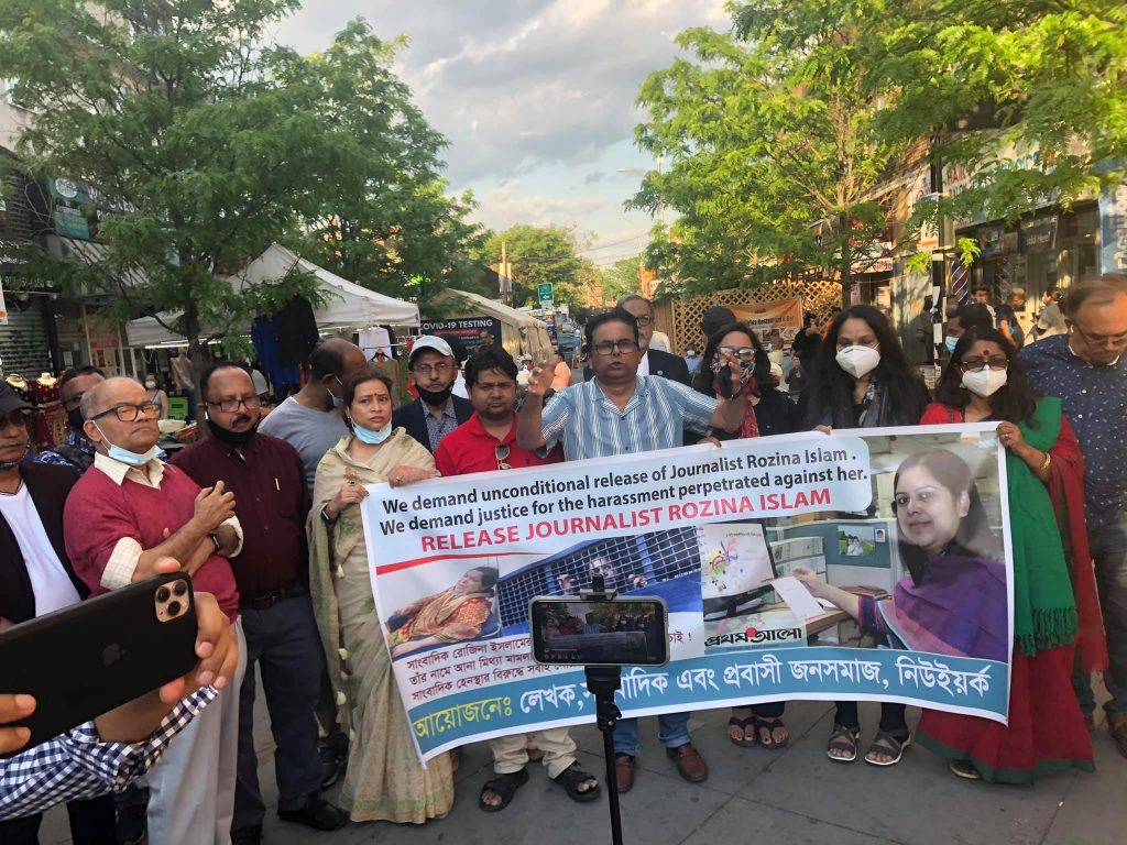 দৈনিক প্রথম আলোর সিনিয়র রিপোর্টার রোজিনা ইসলামের নিঃশর্ত মুক্তি, মামলা প্রত্যাহার ও দোষী কর্মকর্তা-কর্মচারীদের শাস্তির দাবিতে নিউইয়র্কে মানববন্ধন ও প্রতিবাদ সমাবেশ করেছে লেখক, সাংবাদিক এবং প্রবাসী জনসমাজ। সমাবেশ থেকে অবিলম্বে সাংবাদিক রোজিনা ইসলামের মুক্তি দিয়ে তাকে হেনস্তাকারীদের শাস্তির দাবি জানানো হয়। ১৮ মে মঙ্গলবার জ্যাকসন হাইটসের ডাইভারসিটি প্লাজায় এ প্রতিবাদ সমাবেশ অনুষ্ঠিত হয়। সমাবেশে নিউইয়র্ক সহ আশেপাশের রাজ্য থেকে লেখক, সাংবাদিক এবং জনসমাজের প্রতিনিধিরা যোগ দেন।