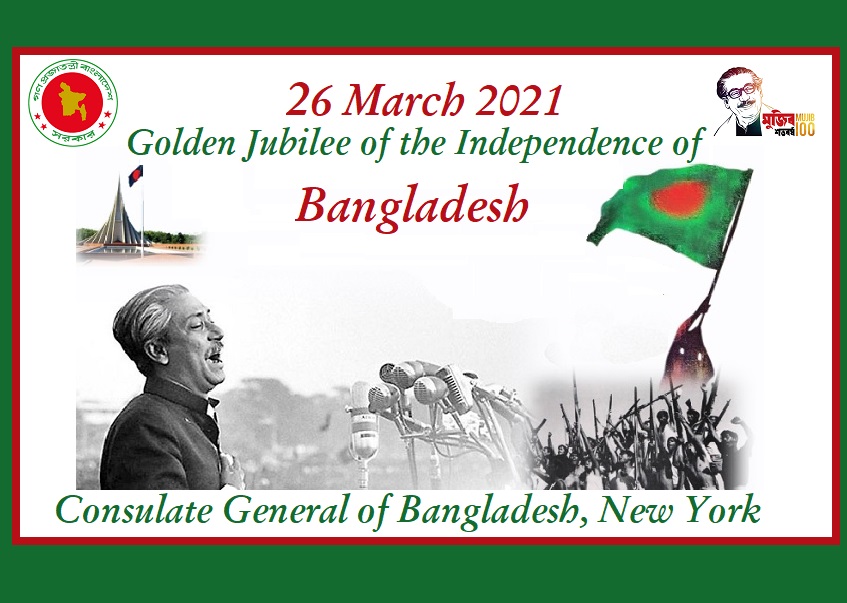 নিউইয়র্কে করোনা ভাইরাসজনিত বৈশ্বিক মহামারীর পরিপ্রেক্ষিতে স্বাগতিক দেশের বিধি-বিধান প্রতিপালন সাপেক্ষে বাংলাদেশ কনস্যুলেট জেনারেল, নিউইয়র্ক আগামী ২৬ মার্চ ২০২১ দুপুর ১২ ঘটিকায় (নিউইয়র্ক সময়) ভার্চুয়ালী বাংলাদেশের মহান স্বাধীনতা ও জাতীয় দিবস – ২০২১ উদযাপন করবে। এই অনুষ্ঠানে যুক্তরাষ্ট্রের কংগ্রেসওমেন গ্রেস মেং, নিউইয়র্ক স্টেট সিনেটর জন সি. ল্যু এবং কুইন্স বোরো প্রেসিডেন্ট ডনাভান রিচার্ডস সহ বীর মুক্তিযোদ্ধাবৃন্দ, বাংলাদেশী-আমেরিকান কমিউনিটি ও বিভিন্ন দেশের রাষ্ট্রদূত/কনসাল জেনারেলবৃন্দের বক্তব্য প্রচারিত হবে। মুক্তিযুদ্ধে অসাধারণ অবদানের জন্য বাংলাদেশ সরকার কর্তৃক “Friends of Liberation War Honor” প্রাপ্ত প্রখ্যাত মার্কিন চলচ্চিত্র নির্মাতা লেয়ার লেভিনও ভার্চুয়াল এ অনুষ্ঠানে বক্তব্য রাখবেন। এছাড়াও, এ অনুষ্ঠানে বাংলাদেশী-আমেরিকান কমিউনিটির অংশগ্রহণে সাংস্কৃতিক পরিবেশনা থাকবে।