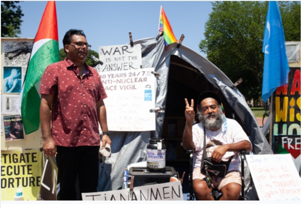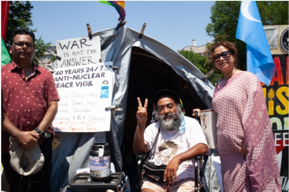 হোয়াইট হাউসের উত্তরের সড়কপাশের ফিলিপস মেলাকু ব্যালো’র তাঁবুর সামনে সমবেত প্রতিবাদি মানুষদের এক সমাবেশে যোগদেন তাঁরা। সারা বিশ্বের নানা সমস্যা নিয়ে প্রতিদিন সরগরম থাকে এলাকাটি।