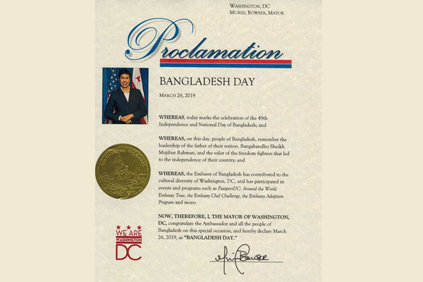 ২৬ মার্চকে ‘বাংলাদেশ ডে’ হিসেবে ঘোষণা ওয়াশিংটন মেয়রের