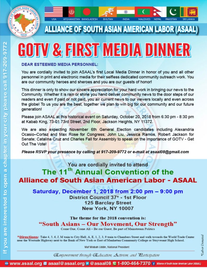 On behalf of ASAAL Executive Council we are inviting you to join us Saturday, October 20, 2018 from 6:00 pm – 9:00 pm at Kabab King, 73-01, 73rd Road, Jackson Heights, NY 11372 for a GOTV event and Local Media Dinner for our print and electronic media’s esteemed Journalists, Editors, and Owners for their selfless community work! Please confirm your attendance with a message! Press Release.