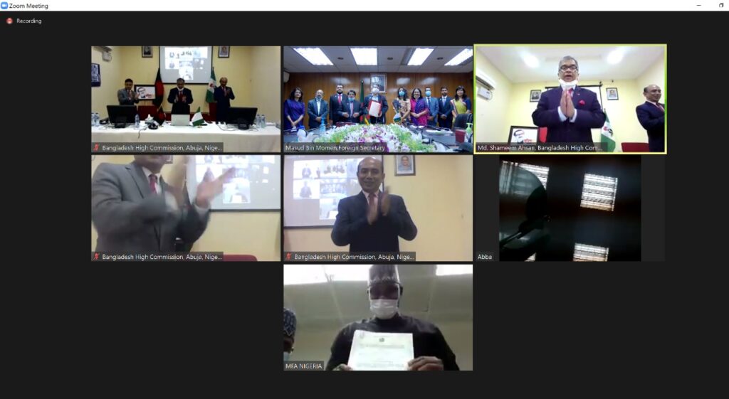 UsaNewsOnline.Com Desk, Dhaka : A Memorandum of Understanding (MoU) on the Establishment of Bilateral Consultations between the Ministry of Foreign Affairs of Bangladesh and the Ministry of Foreign Affairs of Nigeria was signed on Monday, 28 September 2020 on a zoom platform. Foreign Secretary of Bangladesh Ambassador Masud Bin Momen and Permanent Secretary of the Ministry of Foreign Affairs of Nigeria Ambassador Mustapha Lawal Sulaiman signed the instrument on behalf of their respective Ministry. Both of them expressed hope that the signing of the MoU would enable the two Foreign Ministries to hold regular consultations in order to review the progress of bilateral relations and contribute to strengthening the bond of friendship between the two countries in future.