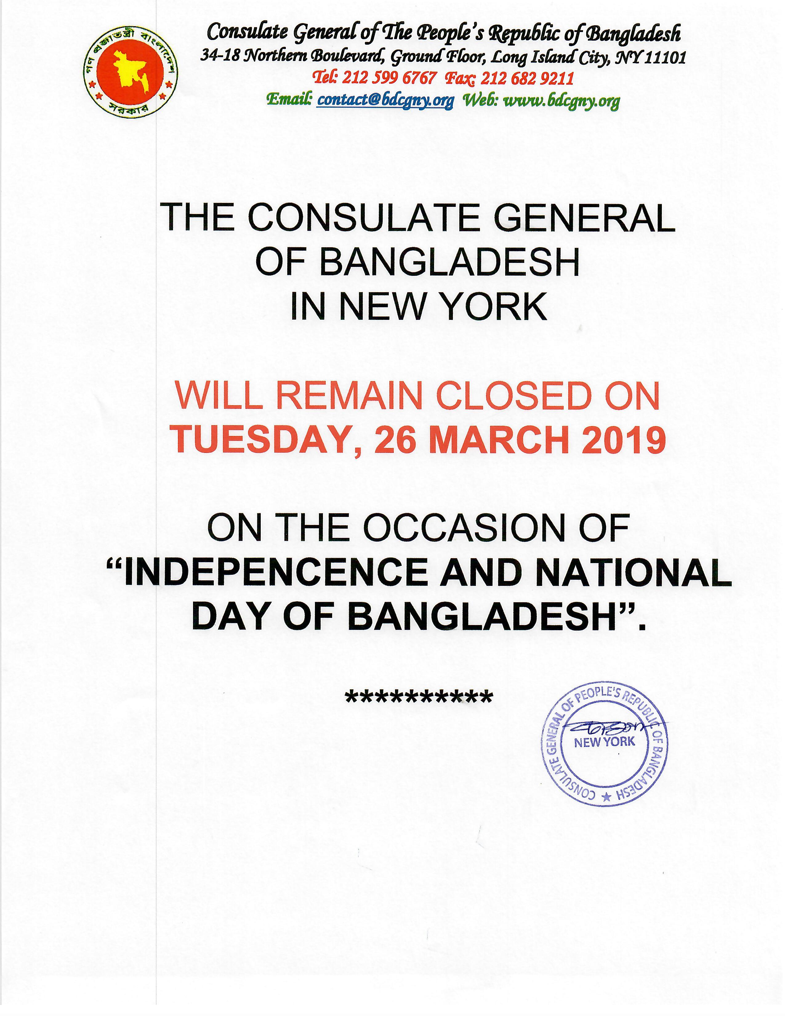 New York : Holiday Notice from the Consulate General of Bangladesh in New York, Bangladesh Consulate General will remain closed on Tuesday, 26 March 2019 on the occasion of Independence and National Day of Bangladesh.