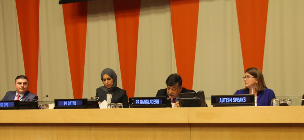 In his statement, the Permanent Representative of Bangladesh stated, “Bangladesh is among the few countries in our region that have not only ratified the Convention on the Rights of Persons with Disabilities, but have also ratified the Optional Protocol. Bangladesh has also included autism, neurodevelopment disorders and disabilities related issues with the National 7th Five Year Plan for 2016-2021”.