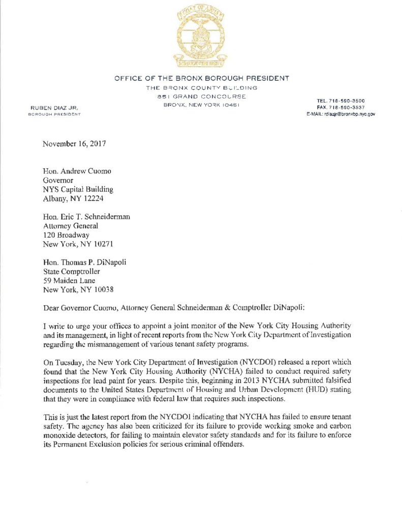 UsaNewsOnline.Com Desk, New York : In a letter to Governor Andrew M. Cuomo, Attorney General Eric T. Schneiderman and State Comptroller Thomas P. DiNapoli, Bronx Borough President Ruben Diaz Jr. has called on the State government to appoint a monitor to oversee the New York City Housing Authority (NYCHA).