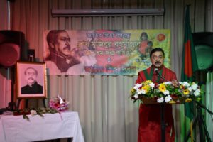 In his statement, H.E. Sheikh Mohammed Belal, Ambassador of Bangladesh in The Netherlands portrayed Bangabandhu as a strong, visionary and beloved leader. He mentioned that, in that crisis period of Pakistan era he was not only a great leader but also such a powerful presence who worked as eternal inspiration for entire nation. He was also fearless and uncompromising. Throughout his life Bangabandhu was moderate, people-centered and liberal; in his towering persona, he was brave, compassionate and loving. Bangabandhu had a great vision but unfortunately did not get enough time to materialize his dreams for the country and its people whom he loved more than himself. The untimely death of Bangabandhu was a great loss for the country. He further highlighted that the responsibility is now upon all of us to build the nation about which he dreamt for. He urged members of Bangladesh community to join with renewed vision in the development journey of Bangladesh from their respective positions. He requested them to inculcate Bangabandhu’s ideology and principle among our next generation.