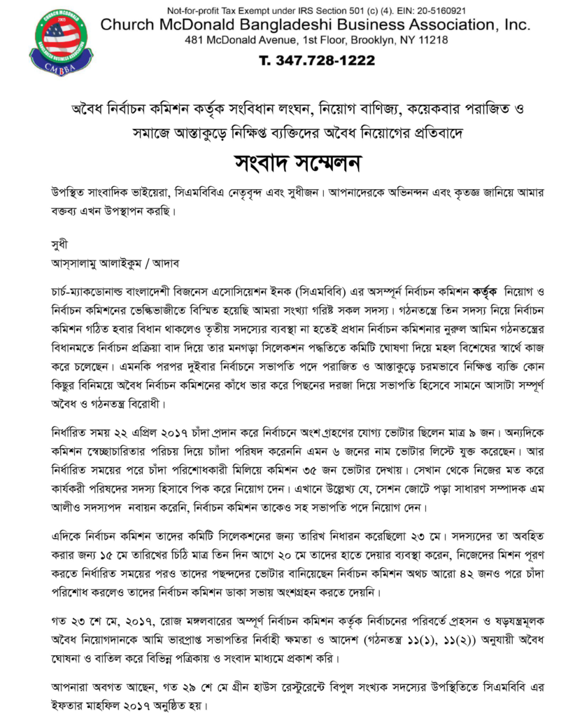 CMBBA and was speaking at the press conference and was held after Zohar prayer where the Bangladeshi Businessmen gathered. Program hosted by the prominent Businessman and Community activist Mohammad Mahab, whom had delivered a speech on behalf of this press conference. They chanted slogan of the few members who had created a committee which was unconstitutionally created. They demand a fair new Election as soon as possible. Lustful Karim who is residing in this locality for more the 35 years and reputed businessman urges everyone to cooperate with each other. CMBBA Treasurer renowned Mohammed Anwar Hossain gave a speech on behalf this occasion. Abu Ahmed the owner of Ador printing and AH Khonodokar Juglu also gave a special speech and demanded early election as soon as possible. Many electronic printing media participated at this press conference.