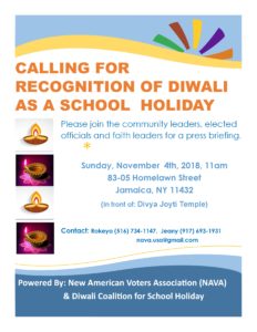 UsaNewsOnline.Com Desk, New York : New American Voters Association (NAVA) & the Diwali Coalition for School Holiday hold a press briefing on Sunday, November 4, 2018, 11am at 83-05 Homelawn Street, Jamaica, NY 11432 (In front of Divya Joyti Temple) in support of Senate Bill S5304 and Assembly Bill A4331, which would establish Diwali as an official public school holiday. Diwali is holiday that is observed by people of Hindu, Jain and Sikh faiths. According to the most recent census, there are nearly 300,000 New York City residents of whom celebrate Diwali. Millions of people around the world keep Diwali by lighting lamps to symbolize righteousness and light overcoming and dispelling ignorance and darkness. It is a five-day festival that begins on the 13th day of the Hindu month of Kartik and observers of the holiday spend time with their loved ones and priests performing prayers.