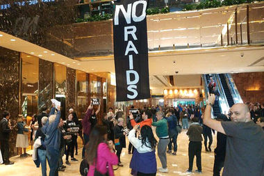 Protesters draped banners reading “No Ban,” “No Wall” and “No Raids” above the lobby at President Donald Trump’s Fifth Avenue skyscraper a little after 2 p.m., video showed.