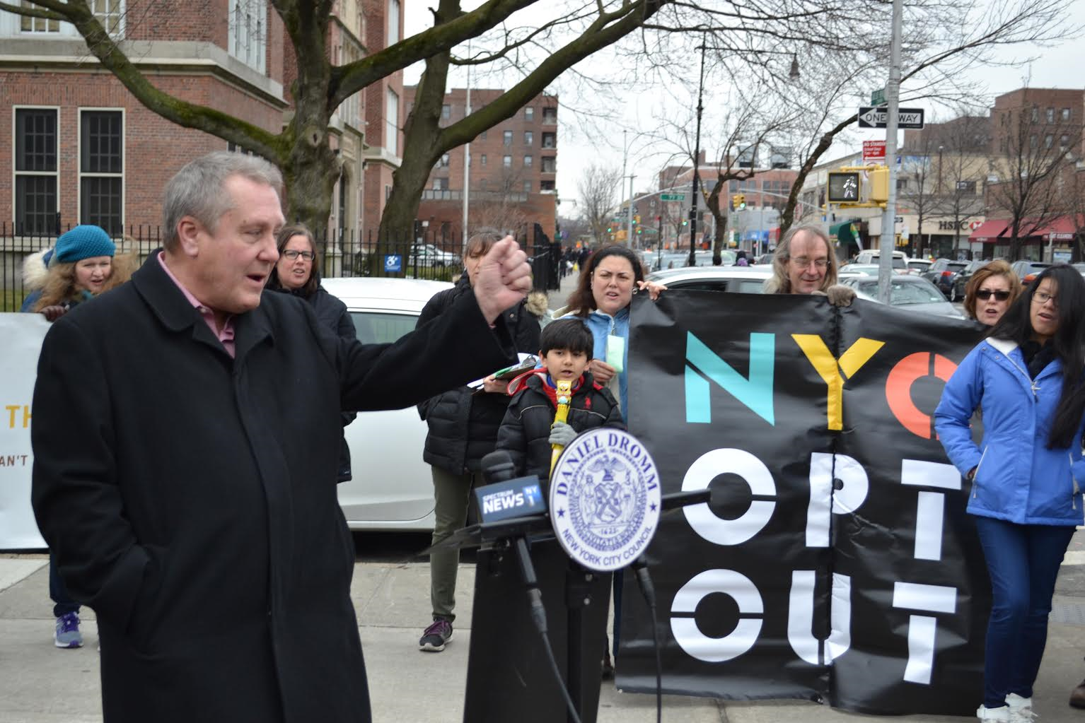 UsaNewsOnline.Com, Jackson Heights, NY – NYC Council Education Committee Chairperson Daniel Dromm (D-Jackson Heights, Elmhurst) once again rallied with education advocates, parents, students and teachers who chose not to have their children take the high stakes New York State English Language Arts (ELA) and math exams. Dromm, a NYC public school teacher for 25 years before being elected to the NYC Council in 2009, is adamant that parents be informed of their right to opt their children out of these tests.