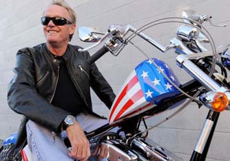 The image of Fonda with his legs stretched out on his Harley-Davidson chopper painted in the colors of the American flag became emblematic of the era — one of two bikes used in the film sold at auction for $1.35 million in 2014.