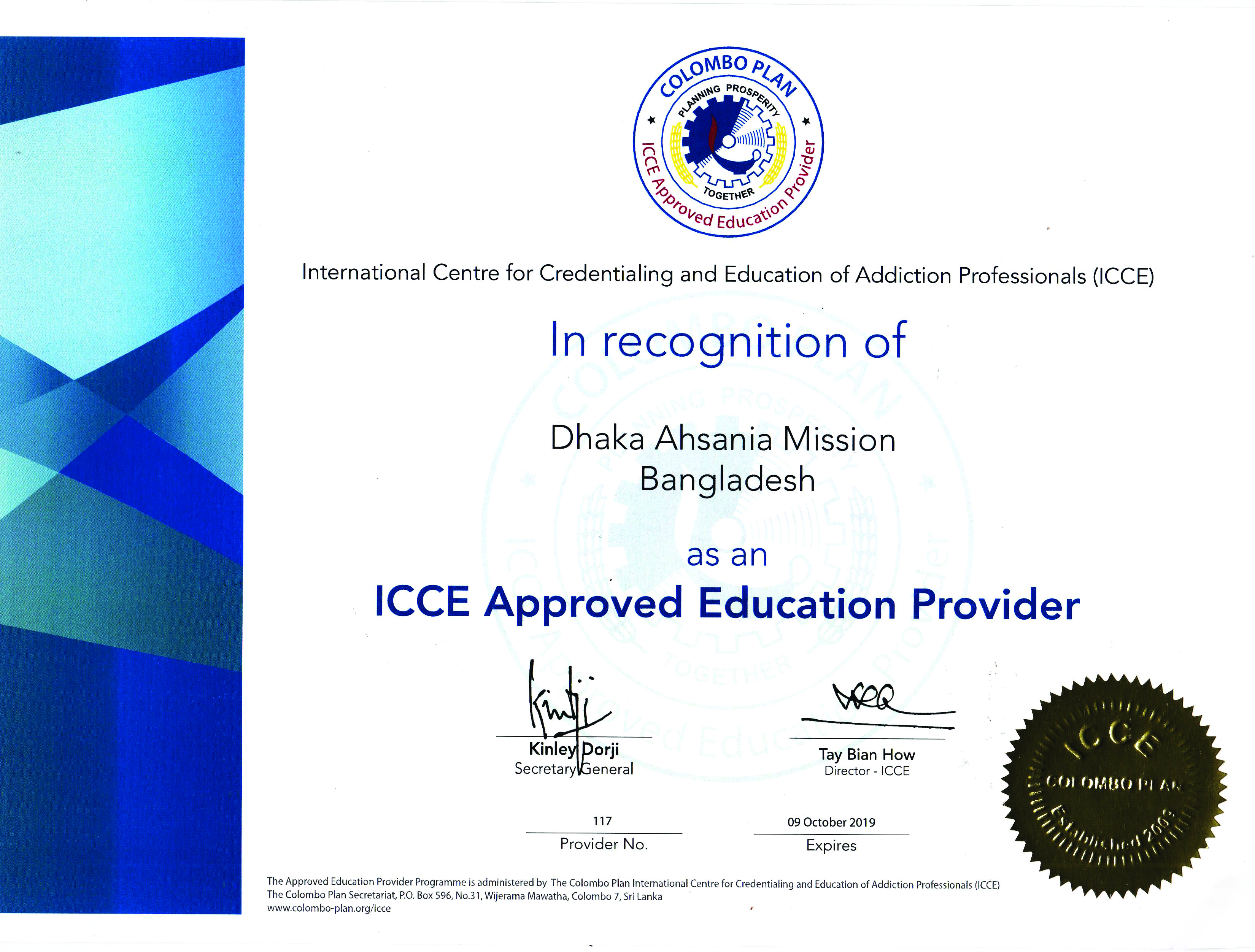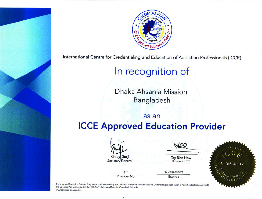 UsaNewsOnline.Com Desk : International Center for Credentialing and Education of Addiction Professionals (ICCE)) of Colombo Plan has recognized Dhaka Ahsania Mission (DAM) for enhancing the capacity of professionals in drug treatment.